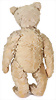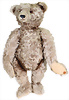 Bär, ca. 1920, mit Knopf, langgezogenes f, Reste weißer Fahne, 70 cm, braun gespitzt, ein wenig ausgeblichen, lange abgeknickte Arme, leichter Buckel, Mohair-Verlust auf der Schnauze, sonst bis auf kl. Stellen gut, einige Filzfehler, außergewöhnliche Gr.