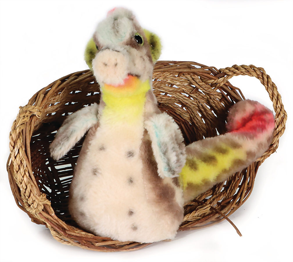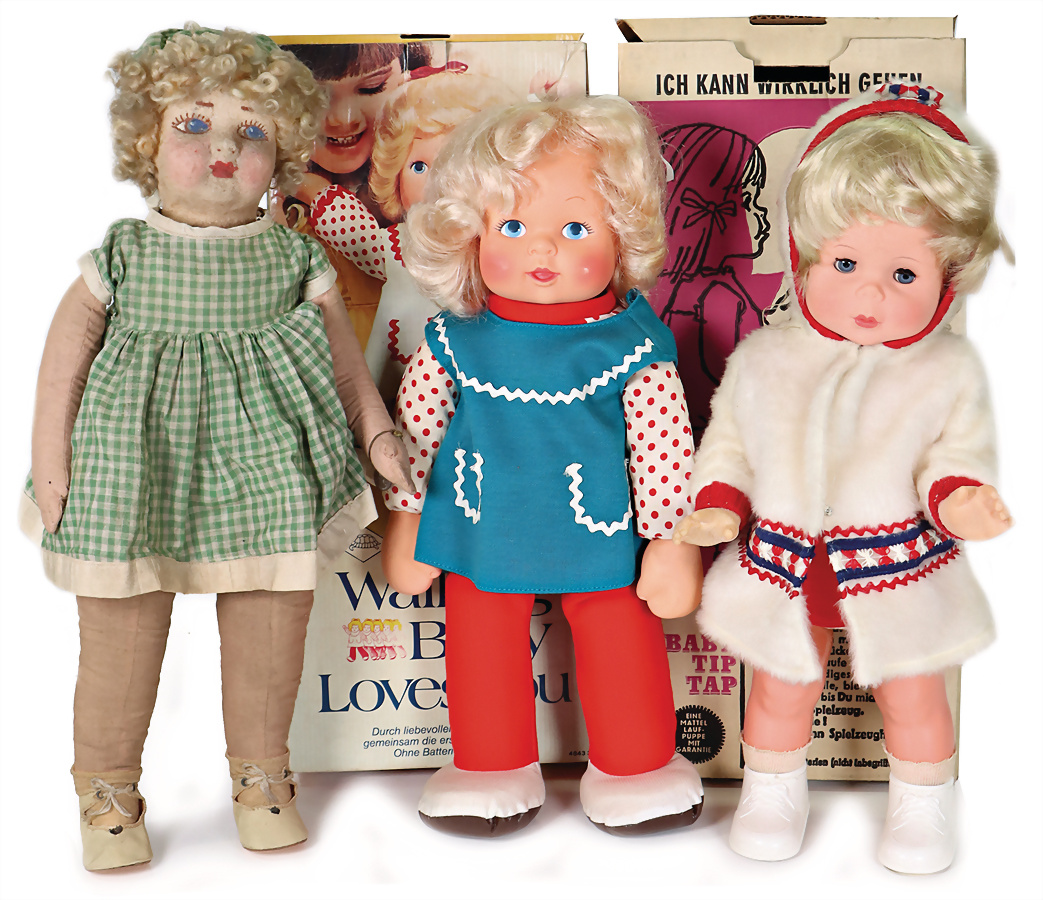 Fremdprodukt aus dem STEIFF Archiv, 3 Teile, Puppen, Nachkrieg, Walking Baby, SCHILDKRÖT, Baby TipTap, MATTEL, neuw. im Orig.-Kart., dazu 1 Filzkopf-Puppe, Augen bemalt, Stoffkörper, 52 cm, Orig.-Kleid, Nase etwas berieben, mit Firmenschild