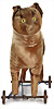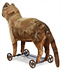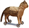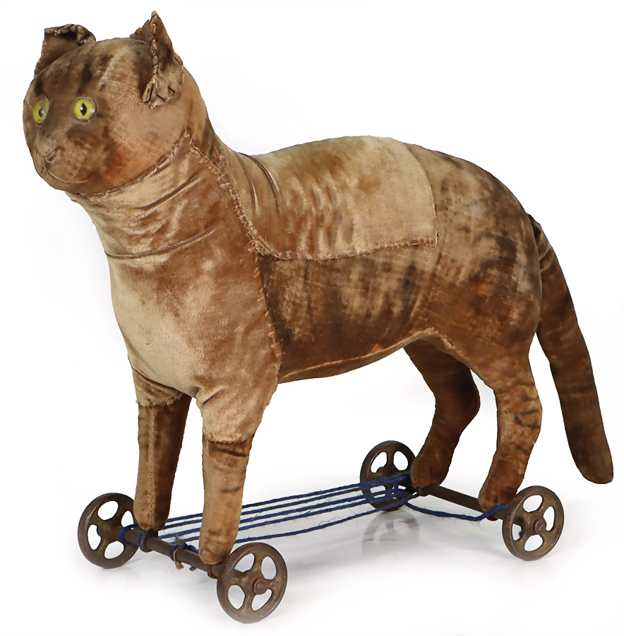 ca. 1910, Samt-Katze auf Guss-Speichenrädern, H: 15 cm, 2 gr. Samtflicken aufgenäht, Ohren wohl 1x neu angenäht, mit Knopf