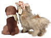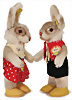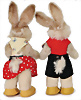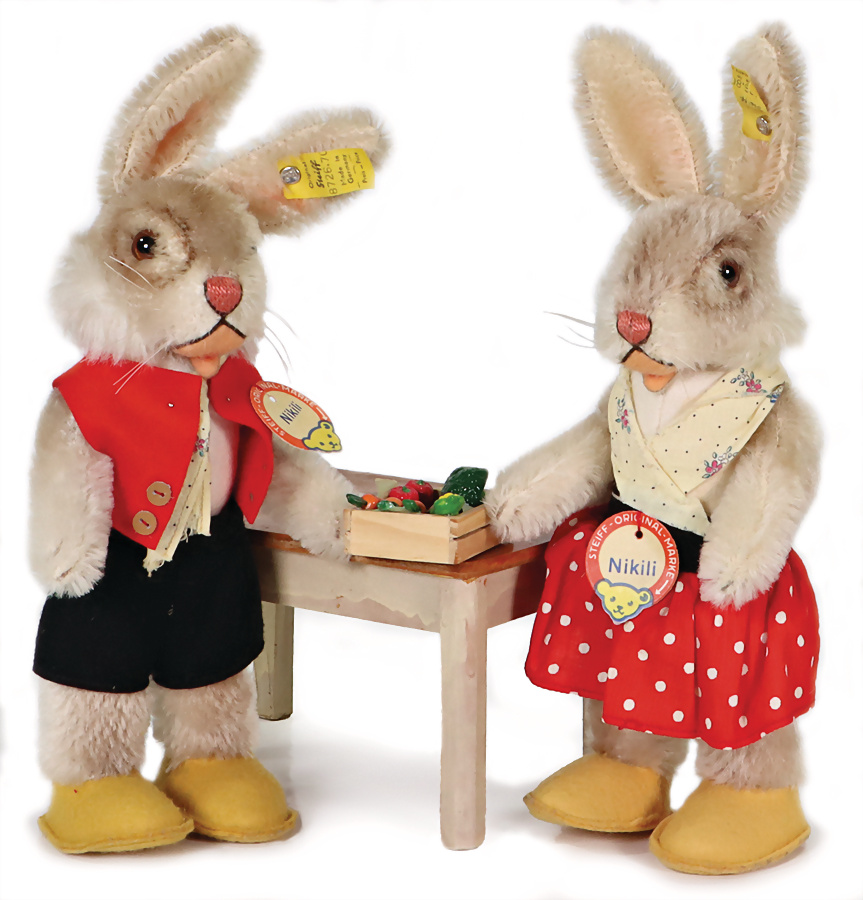 Hasenpaar, Nikili, Bub und Mädchen, hergestellt 1959-62, Mohair-Kopf, Arme und Beine, Filzkleidung, mit Knopf, Schild und Fahne, Bub Nr. 8726,70, Mädchen 8726,80, orig. Kleidung, sehr schöner unbespielter Zust.