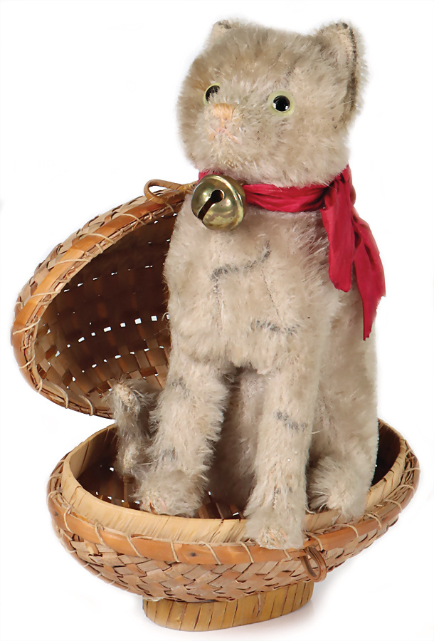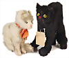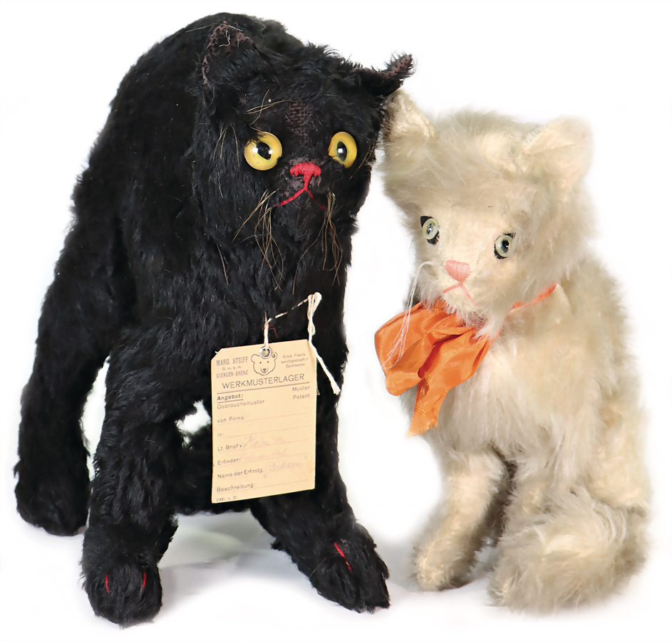 Fremdprodukt aus dem STEIFF Archiv, 2 Teile, Katze, sitzend, 27 cm, Langhaar-Plüsch, kl. Stellen Plüschverlust, sonst gut, schwarzer Kater, wohl Vorkrieg, stehend, 34 cm, Mohair-Plüsch, mit Werksmuster-Anhänger, guter Zust., Schnauze ein wenig gedrückt