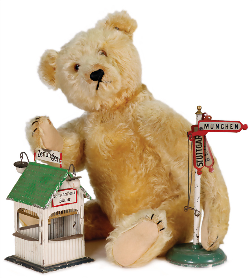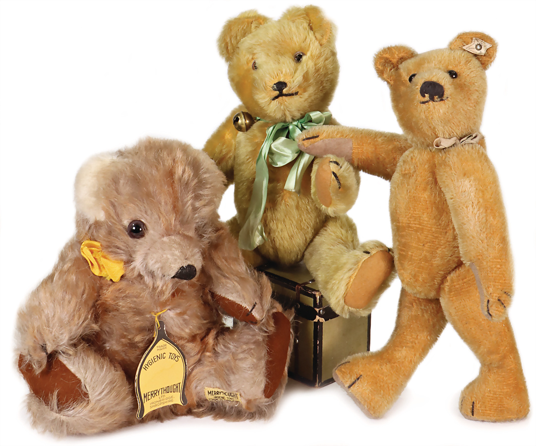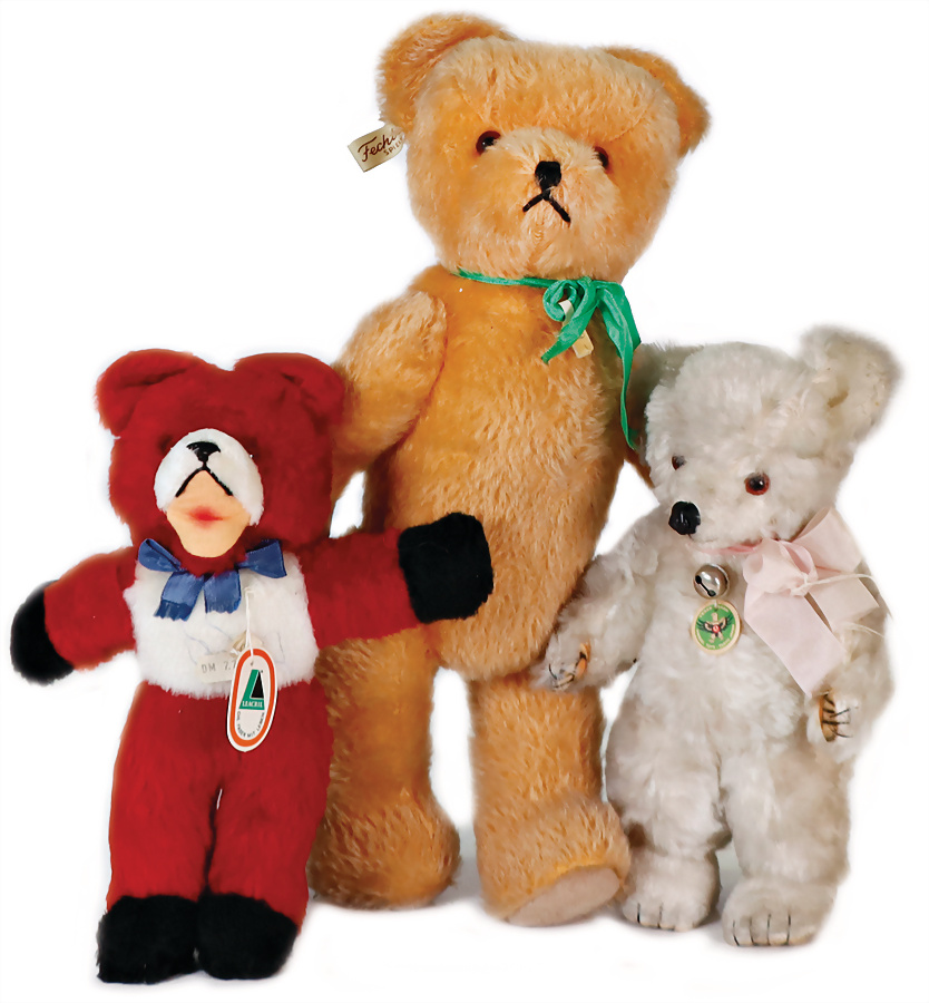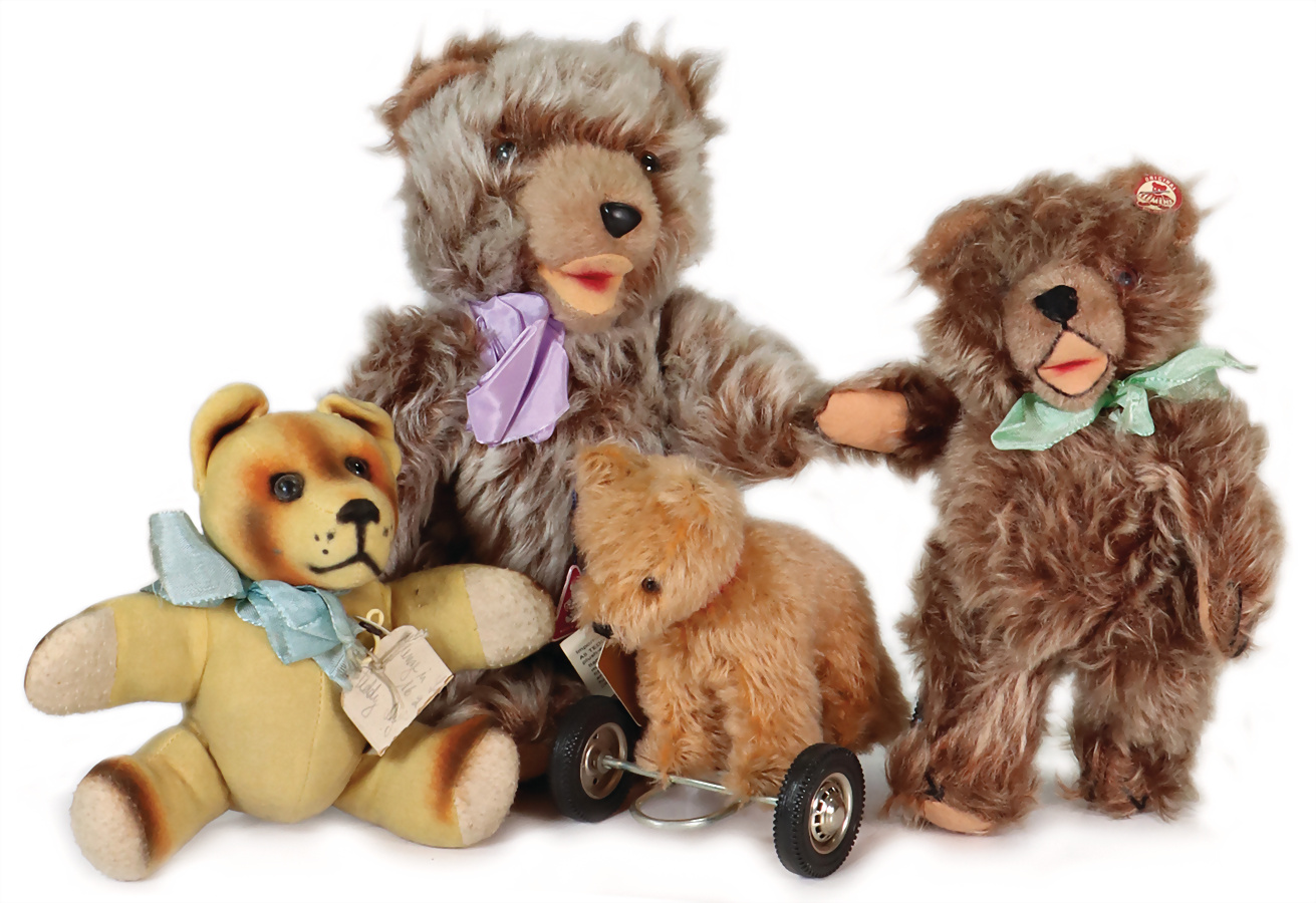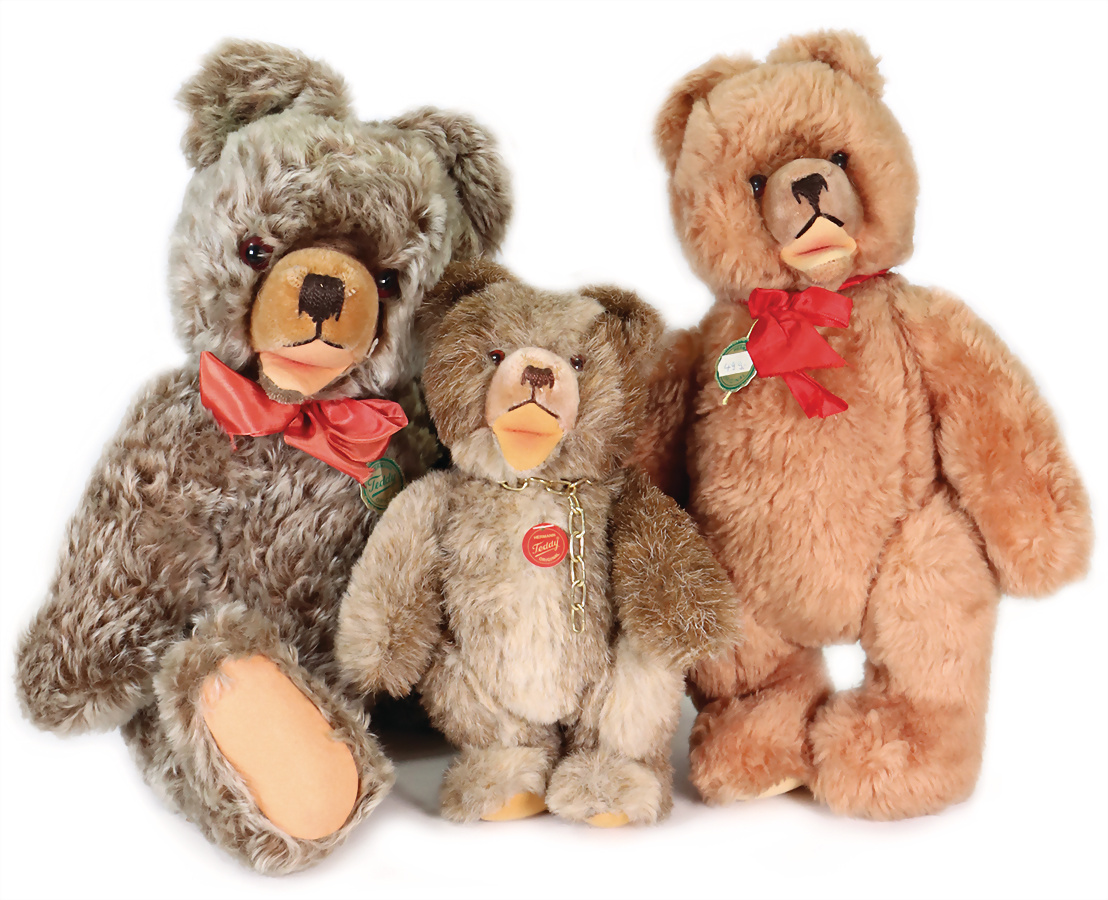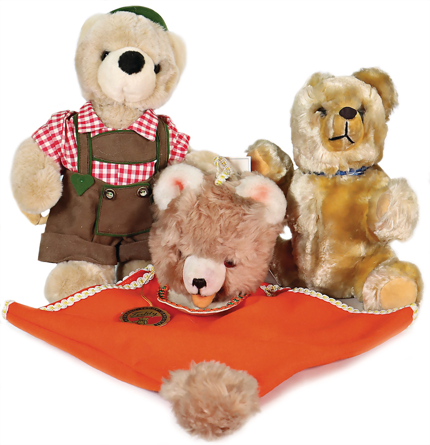 Fremdprodukt aus dem STEIFF Archiv, 2 Teile, Bären, Typ Zotty, CLEMENS, 22 u. 26 cm, Nachkrieg, mit Schild, guter Zust., HERMANN Bär auf Rädern, H: 14 cm, sehr guter Zust., 1 Bär STEINHÄUSER, Samt, H: 16 cm, mit STEIFF Archiv-Anhänger, guter Zust.