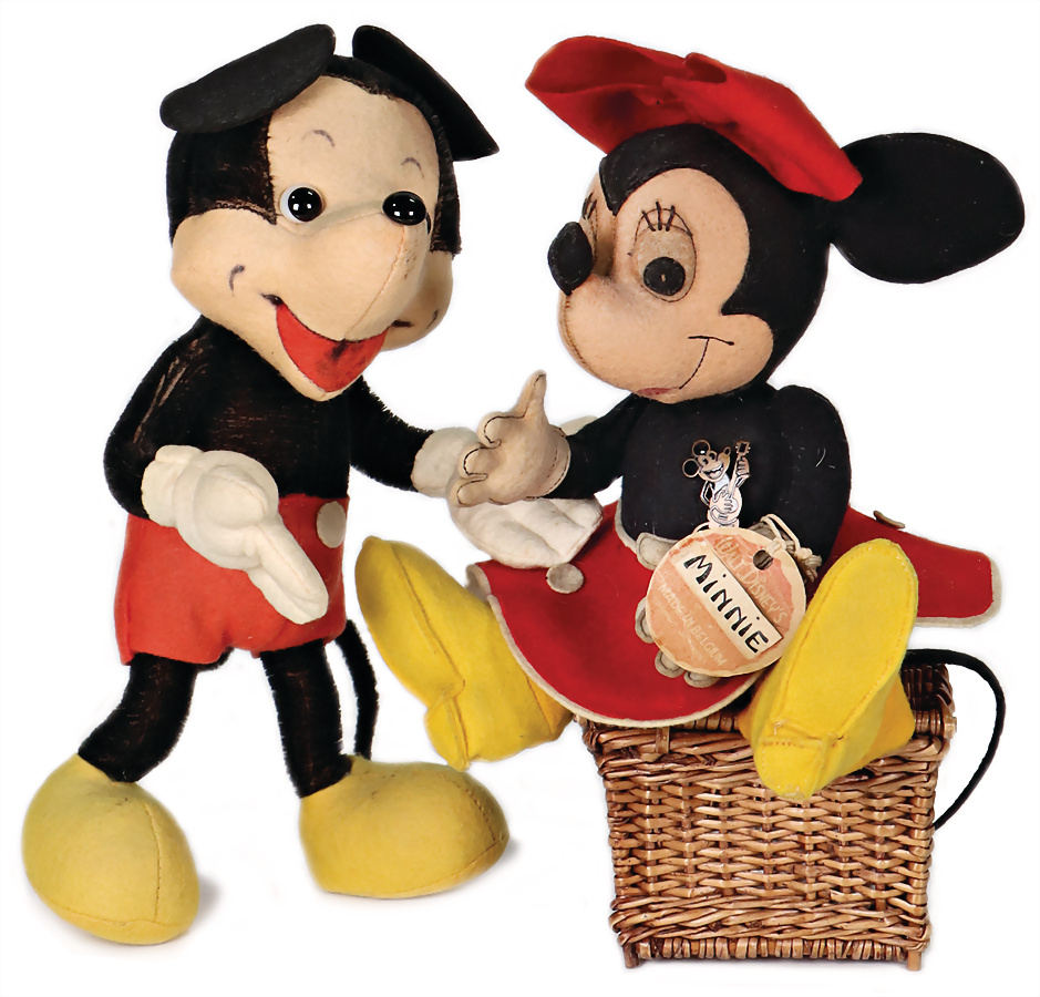 Minnie - und Micky Maus, Made in Belgien, in Filz, sowie mit kurzem Mohair, 24 cm, ca. 1940, 1 x mit orig. Papier Schild