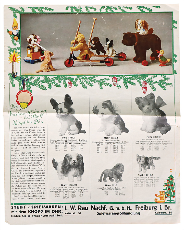Steiff Prospekt von 1928, 4 Blättrig, schöne teilweise farbliche Abbildungen von Bully, Charly, Petsy, Steiff Tretmobil und mehr