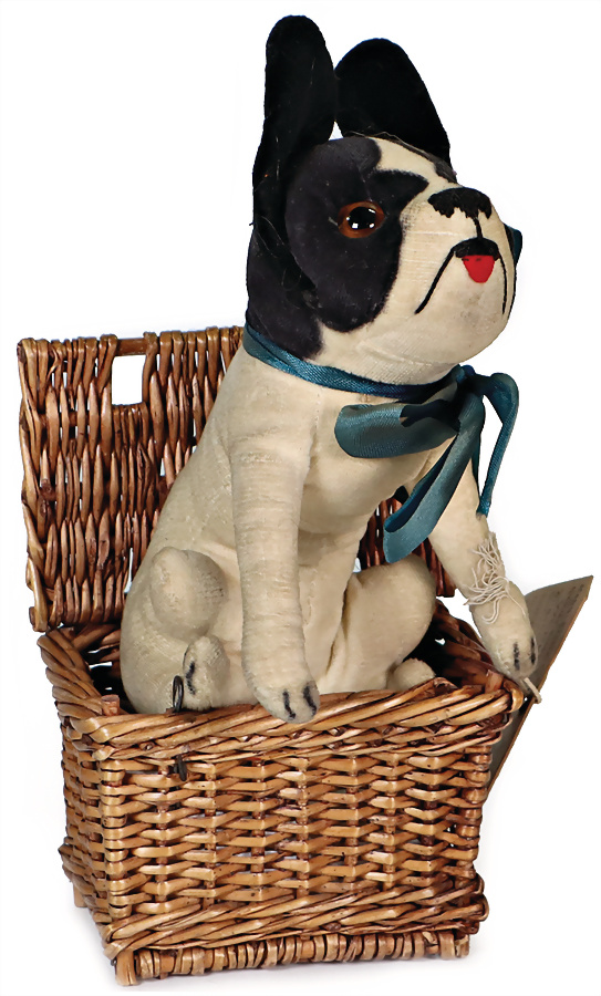 Fremdprodukt aus dem STEIFF Archiv, Samt-Bully, sitzend, 12 cm, Vorkrieg, Glasaugen, mit Werksmuster-Anhänger, sehr guter Zust.