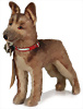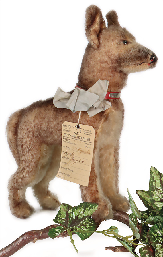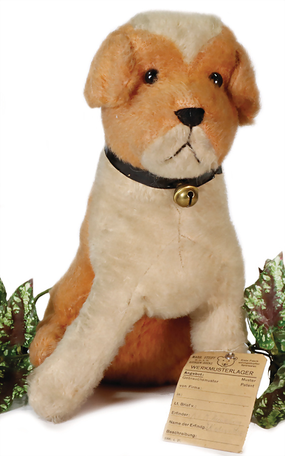 Fremdprodukt aus dem STEIFF Archiv, Hund, sitzend, HERMANN TIEZ, Vorkrieg, Kunstplüsch, Knopfaugen, Orig.-Halsband mit Glocke, mit Werkmuster-Anhänger, mit Herstellerschild, guter Zust. H: 30 cm