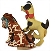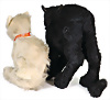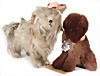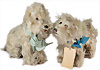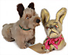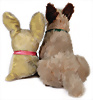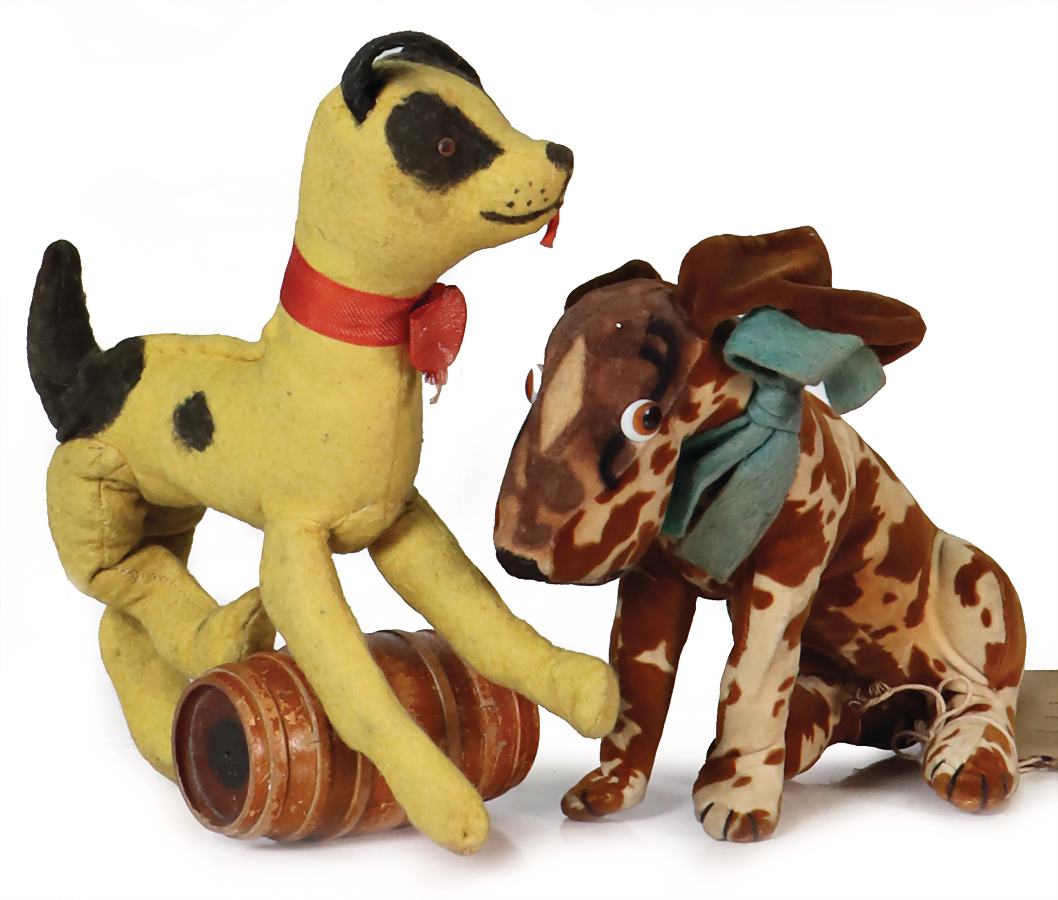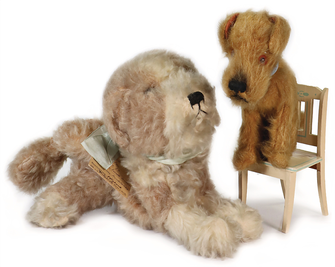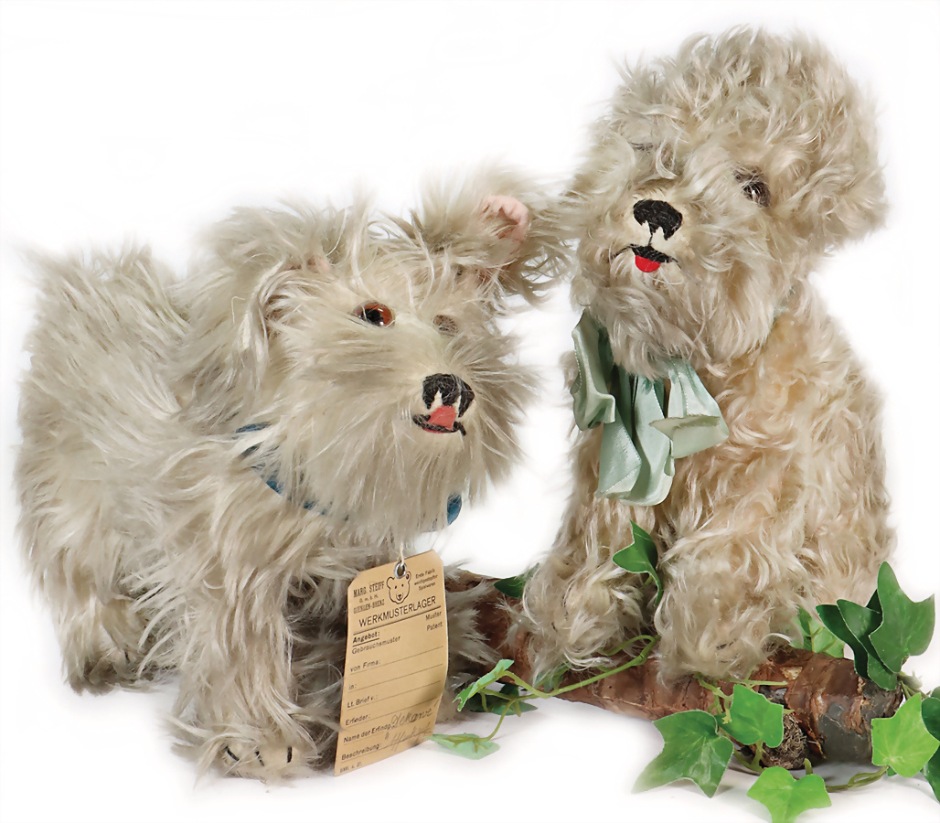 Fremdprodukt aus dem STEIFF Archiv, 2 Teile, Hunde, PANURGE, England, Kunstplüsch, Sitzhöhe 18 cm, sitzend, 17 cm, Karikatur-Glasaugen, Firmenanhänger J.&Co., mit STEIFF Werkmuster-Anhänger, sehr guter Zust.