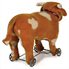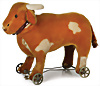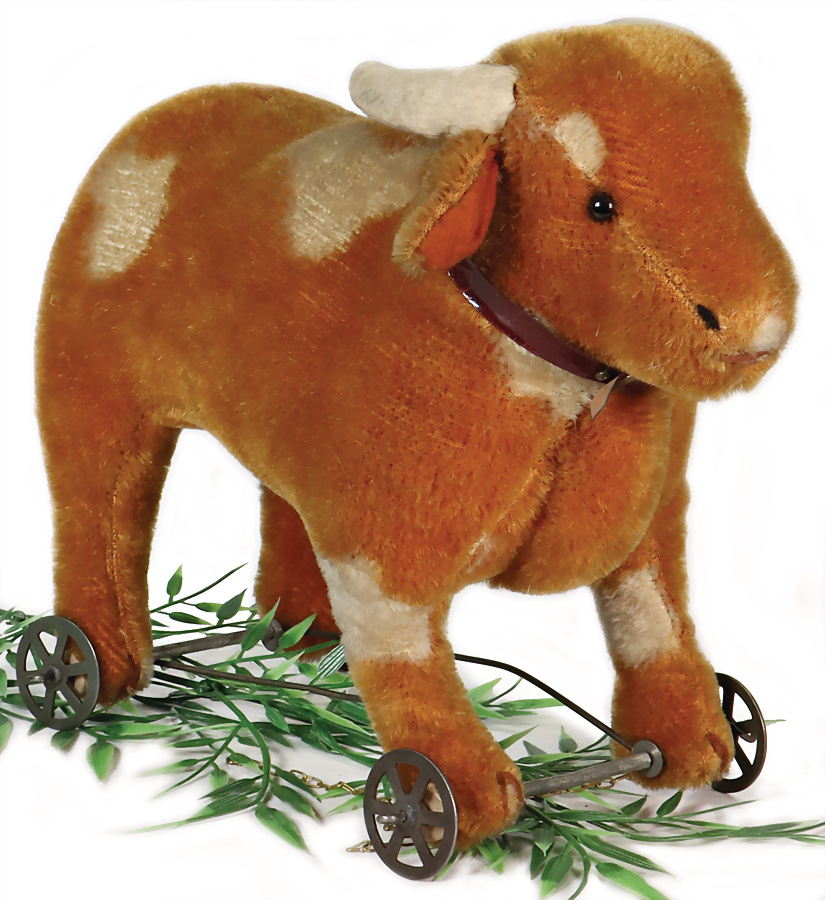Fremdprodukt aus dem STEIFF Archiv, Ochse, 30er Jahre, Kurzmohair-Plüsch, Glasaugen, Filzhörner, durchbrochene Blechräder, H: 21,5 cm, sehr guter Zust.