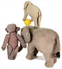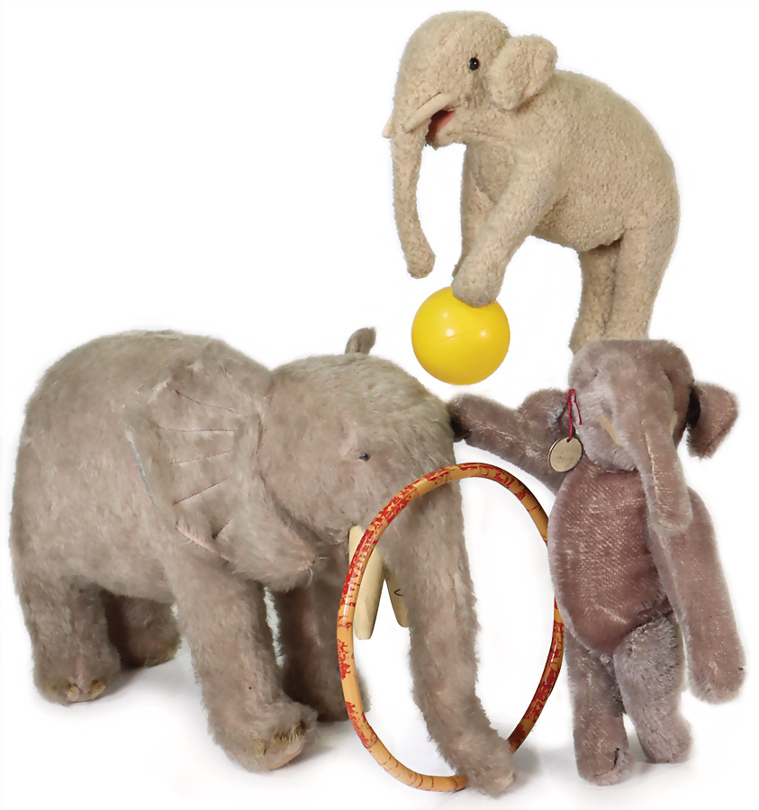 Fremdprodukt aus dem STEIFF Archiv, Elefant, Kunstplüsch, kl. Glasaugen, H: 24 cm, 1x Elefant, Wollplüsch, Glasaugen, H:16 cm, Elefant, 5-fach gegliedert, Kurzplüsch, Filzstoßzähne, mit Metallplakette, Vorkrieg, guter Zust.