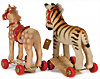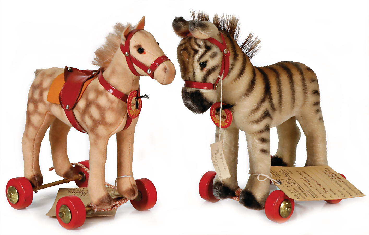 Fremdprodukt aus dem STEIFF Archiv, 2 Teile, HAMIRO, Tschechien, Zebra, H: 19,5 cm, Pony, Filz, H: 20 cm, mit Werksmuster-Anhänger, mit Firmenschild, auf Holzrädern, sehr guter Zust.
