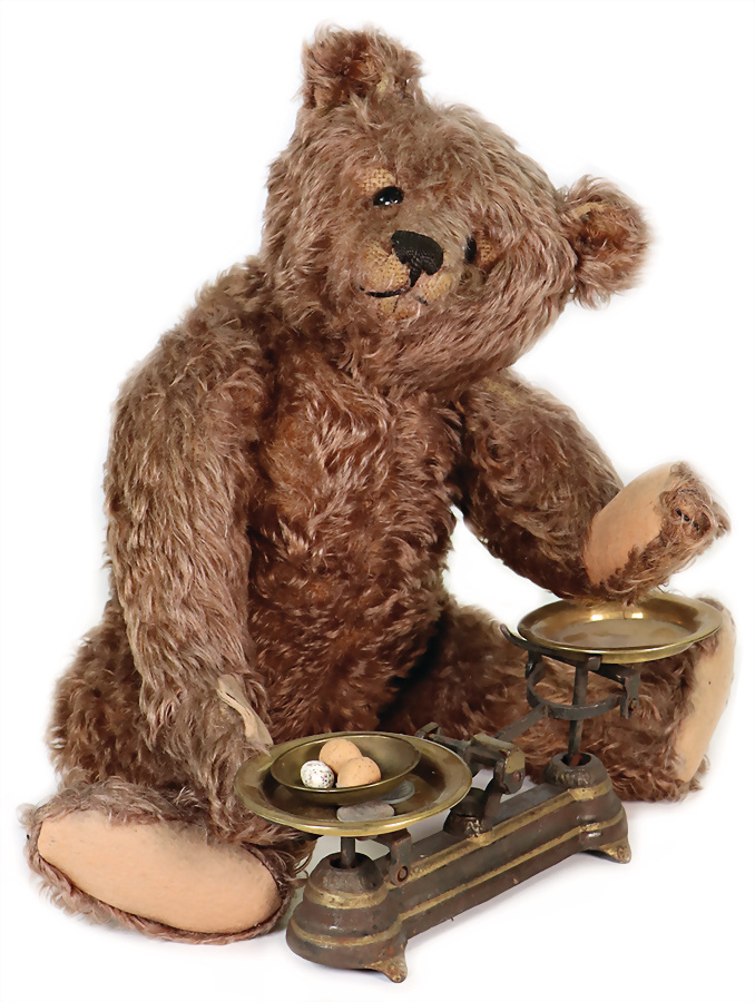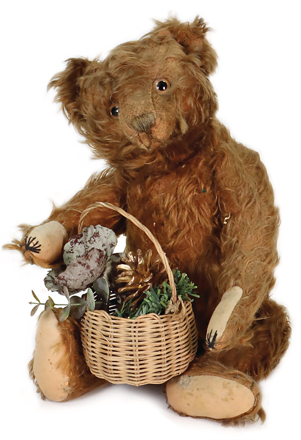 Bär, ca. 1925, mit kleinem Steiff Knopf, langgezogenes f, braune Glasaugen, dunkle Nasenbestickung, eine Naht lose, dunkelbraunes Mohair an vereinzelten Stellen etwas licht, sowie größere kahle Stelle seitlich am Rücken, lange abgeknickte Arme, deutlicher Buckel, kleinere Fehler an den Filztatzen, 54 cm, schöner Ausdruck