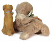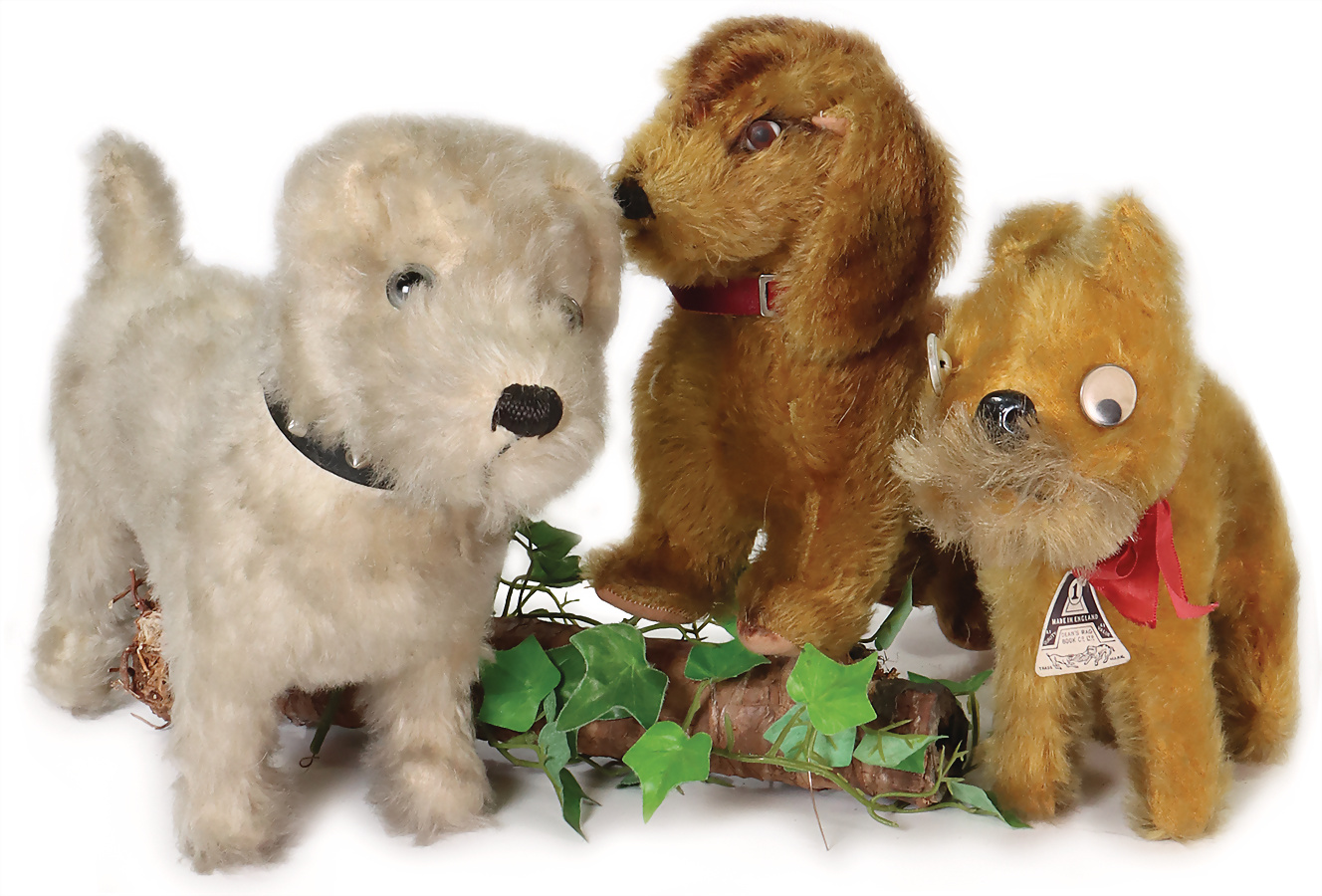 Fremdprodukt aus dem STEIFF Archiv, Hunde, Dackel, Mohair-Plüsch, Glasaugen, Filztatzen, H: 20 cm, Hund, Kunstplüsch, Glasaugen, auf 4 Pfoten stehend, H: 25 cm, Hund, England, 24 cm, Karikaturaugen, mit Papierschild, guter Zust.