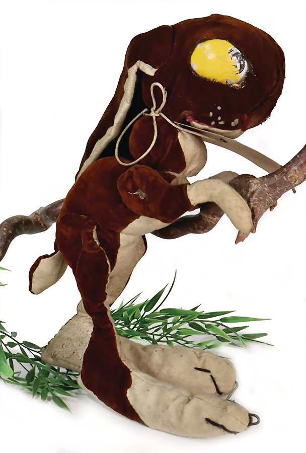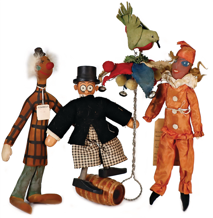Fremdprodukt aus dem STEIFF Archiv, SCHOENHUT, Figur, Holz gegliedert, 19,5 cm, Clownfigur, Stoff, 27 cm, mit STEIFF Archiv-Anhänger, 1929, Clownfigur, Gummi, 26,5 cm, 1 Schelle, mit Vogel, Filz, wohl 20er Jahre