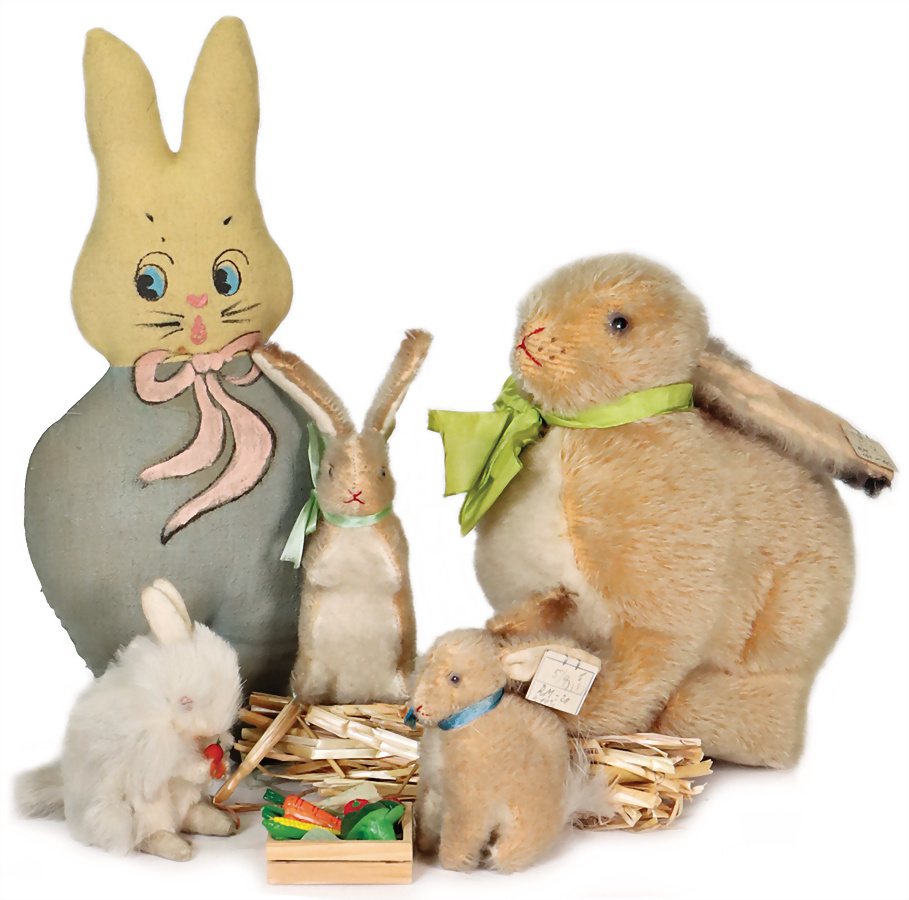 Fremdprodukt aus dem STEIFF Archiv, 5 Teile, Hasen, Schmelzer, S, 26,5 cm, handbemalt, Plüschhase, sitzend u. aufwartend, mit Glasaugen, 8,5 u. 13 cm, mit Knopf, mit Papierschild, Hase sitzend mit Papierschi16 cm, Vorkrieg, kl. Fellhase, guter Zust.