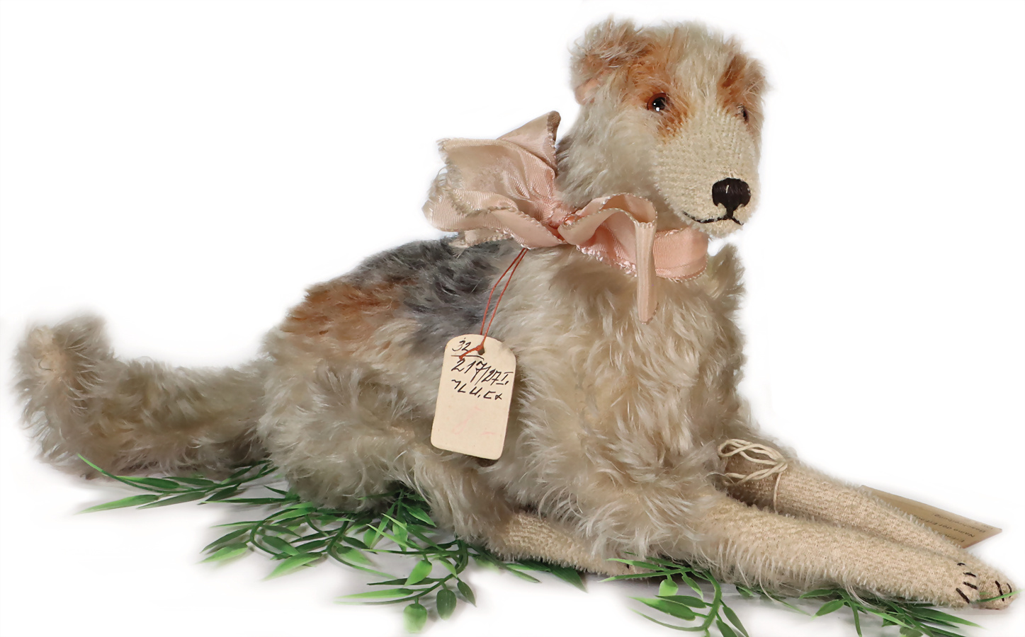 Fremdprodukt aus dem STEIFF Archiv, 2 Teile, Hund, JOHANN WAGMANN LEIPZIG, 1931, Lang-Mohair-Plüsch, Glasaugen, H: 20 cm, mit STEIFF Werkmuster-Anhänger, Doggie Monti, Farnell, England, wohl 50er Jahre, Sitzhöhe 18 cm, Kunstplüsch, Glasaugen mit Schild, guter Zust.