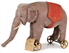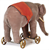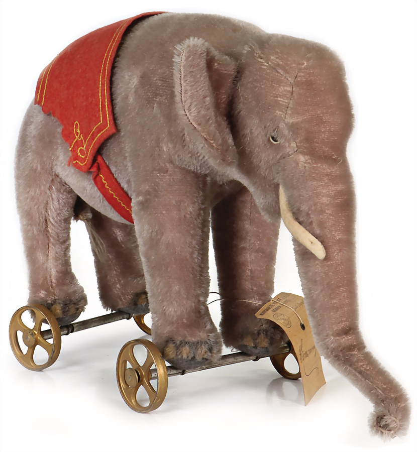 Fremdprodukt aus dem STEIFF Archiv, Elefant auf Guss-Speichenrädern, Mohair-Plüsch, Knopfaugen, Filzdecke, H: 27 cm, ca. 1910, mit Archiv-Anhänger, Filzdecke 1 Stück an 1 Seite fehlt, sonst sehr guter Zust.