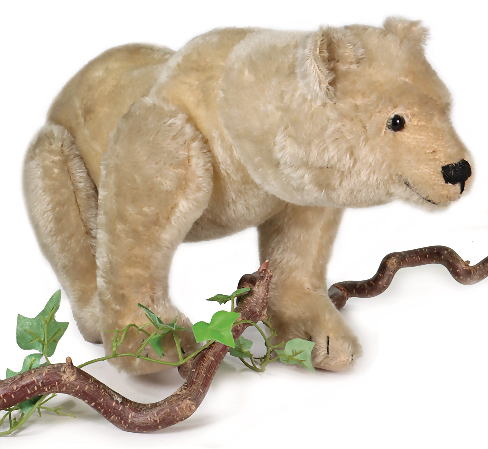Bär, um ca. 1948 bis 1950, mit blau emaillierten Steiff Knopf, braune Glasaugen dunkle Nasenbestickung, gelb/goldenes Mohair, lange abgeknickte Arme leichter Füllverlust in der Armbeuge, sowie vereinzelt Mohairverlust, Filztatzen bis auf kleinere Fehler in sehr gutem Zustand, 43 cm, ausdrucksstark