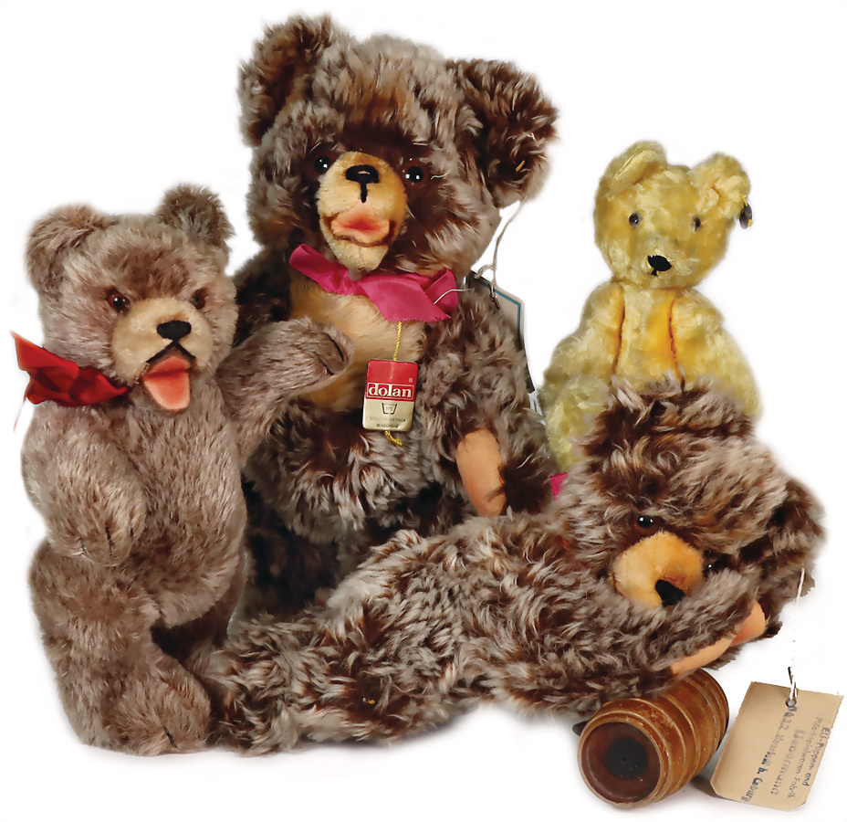 Fremdprodukt aus dem STEIFF Archiv, 4 Teile, Bären, MERRYTHOUCHT HYGIENIC, England, 23 cm, Plüsch, weich gestopft, Glasaugen, Filztatzen, mit Schild, 1x zur Materialprobe geöffnet, mit Archiv-Anhänger, 08.01.36, Bär, 30 cm, Kurzhaarplüsch, Glasaugen, Filztatzen, mit Knopf u. Papierschild, Österreich, 30 cm, Bär, gelbes Mohair, 30 cm, Glasaugen, Filztatzen, sehr guter Zust., wohl Vorkrieg