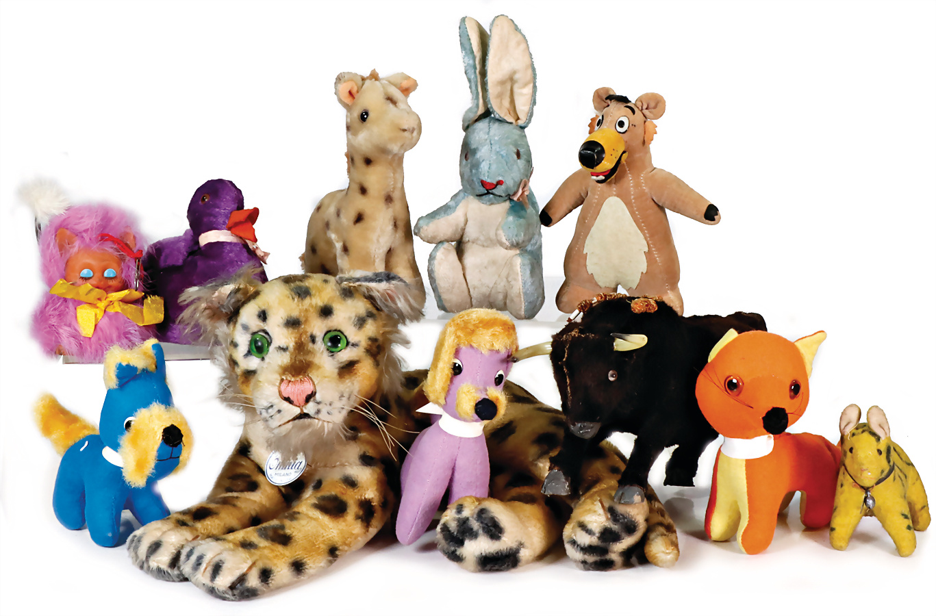 Fremdprodukt aus dem STEIFF Archiv, Nachkrieg, Katze, My Kitty, Stier aus Arena, Hund, Zebra, Ente, Hase, Kunstplüsch, 21 cm, Bär, 1 Lux, OMINA, Mailand, Italien, H: 16 cm, guter Zust.