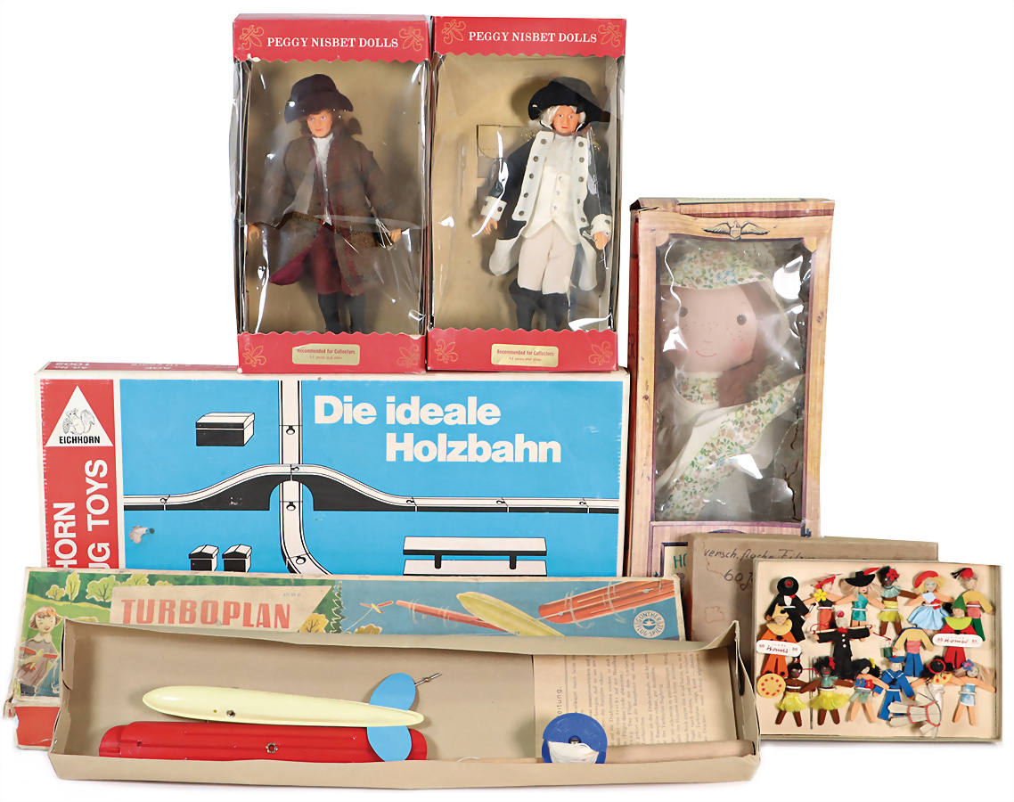 Fremdprodukt aus dem STEIFF Archiv, versch. flache Filzpuppe, H; 5 cm, im Orig.-Kart., Peggy, Inspect Dolls, 2 Teile, Holly Hobbie´s Friend Theater, KNICKERBOCKER TOY CO. INC. NEW YORK, Turbomlan, Flugzeug, EICHHORN, Ideale Holzbahn, Nachkrieg, im Orig.-Kart.