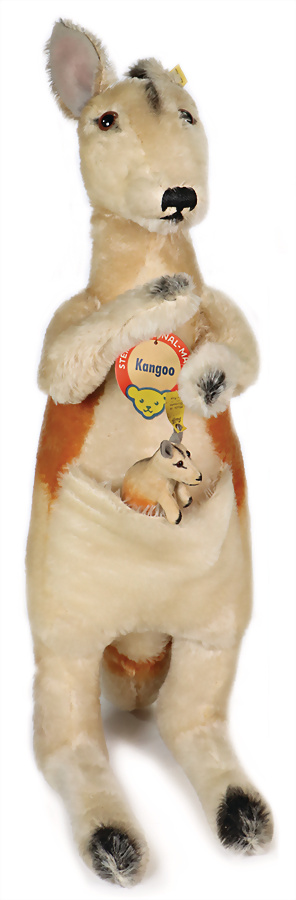 Kangoo, Känguru, kompl., mit Knopf, Schild u. Fahne, Nr. 4350.00, Mohair-Plüsch, Kind Filz, Nr. 4410.00, 48 cm, sehr guter unbespielter Zust., außergew. Gr.