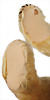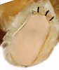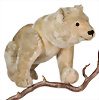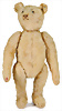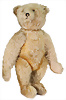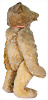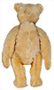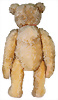 Bär, ca. 1947, goldenes /gelbes Kurzmohair, stärker abgeliebt, mit blankem Knopf, Druckstellen an den Füßen, lange abgeknickte Arme, Buckel, helle Nasenbestickung, Glasaugen ausgeblichen, Farbdifferenz an der rechten Pfote, 36 cm