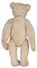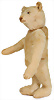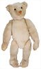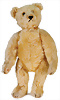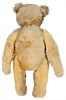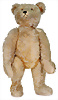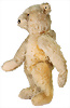 Bär, hergestellt um 1930, 50 cm, mit Knopf, Druckbuchstaben, langgezogenes f, Glasaugen, dunkle Nasenbestickung berieben, ursprünglich gelb/goldenes Mohair ausgeblichen, lange abgeknickte Arme, deutlicher Buckel, Filztatzen in sehr gutem Zustand, schönes volles Mohair mit lieblichem Ausdruck