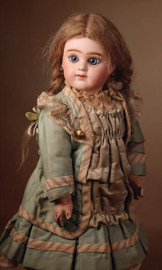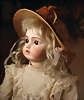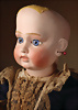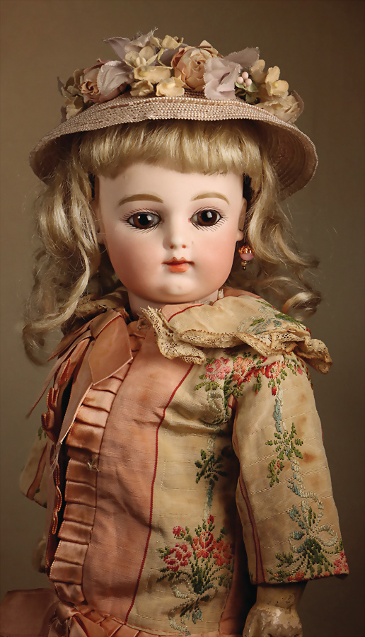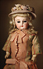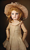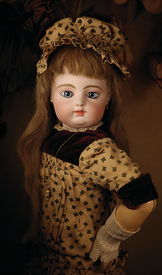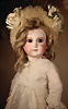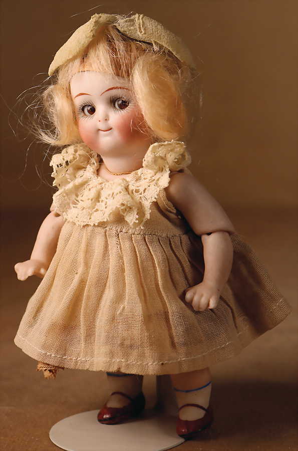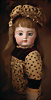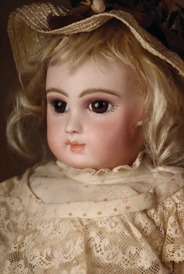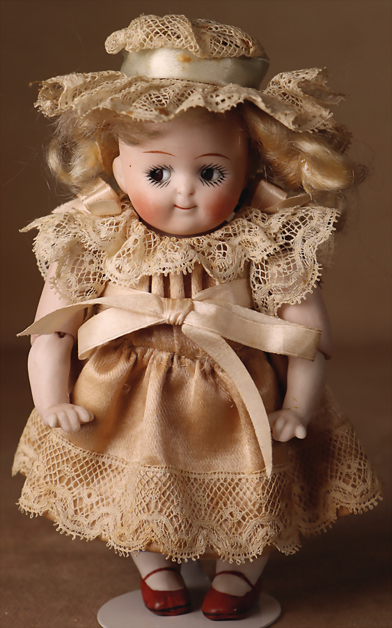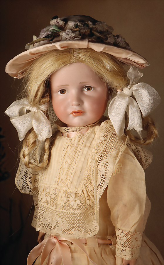 fein modellierter Biskuit-Vollkopf, eingesetzt mit großen braune Spiral-Glasaugen mit dunkler akzentuierten Irisrändern, betontem Lidstrich, zart gemalten Wimpern und in feinen Pinselstrichen ausgeführten Augenbrauen, rosa Lidschattierung sowie dezent akzentuierte Nasenflügel und Augenwinkel, geschlossener Mund mit stark modellierte Oberlippe und klar definierter Trennung zwischen schattierten und konturierten Lippen, durchstochene Ohrläppchen blonde Mohair-Perücke, originaler Sonneberger Kompositions- und Holzkörper, voll kugel gelenkig gearbeitet, mit geraden Handgelenken; originale Körperfassung erhalten Zustand: allgemein exzellenter Erhaltungszustand, kleiner Chip am linken Ohrloch