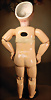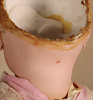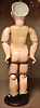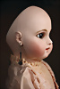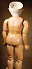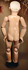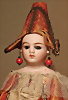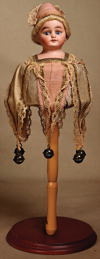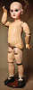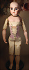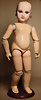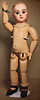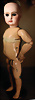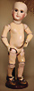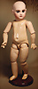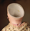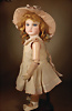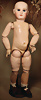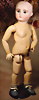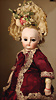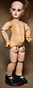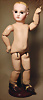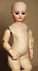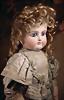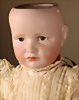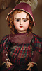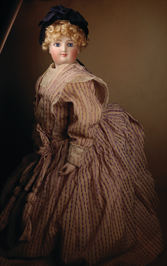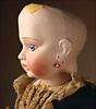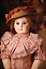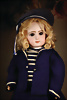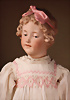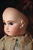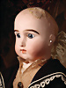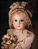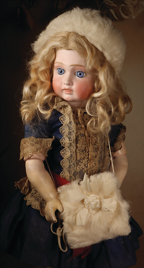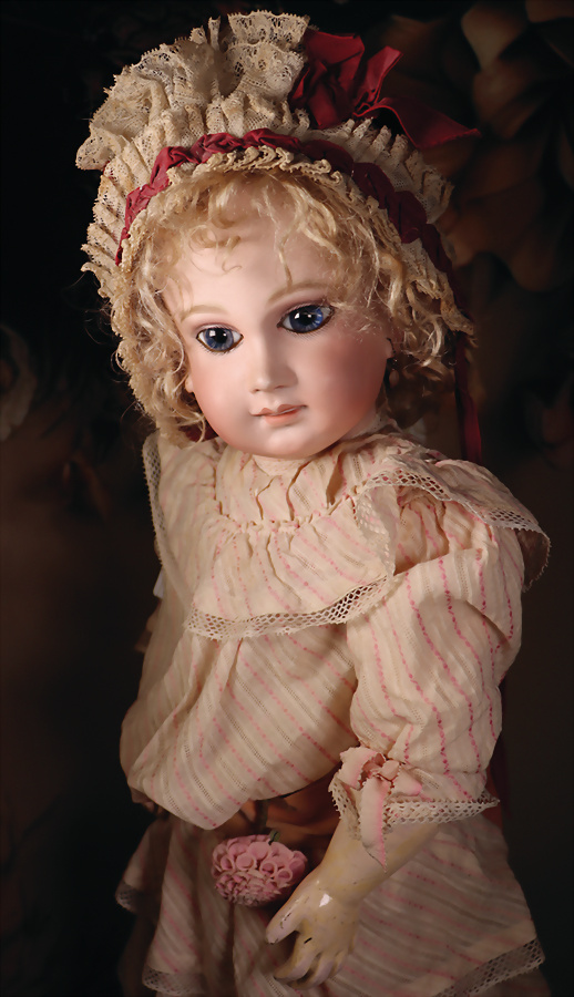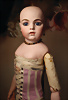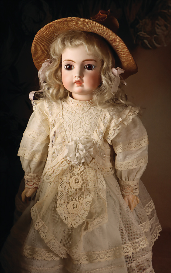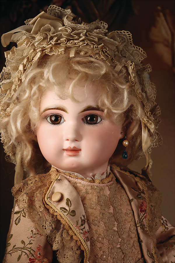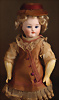 fein modellierter Biskuit-Vollkopf, eingesetzt mit großen braune Spiral-Glasaugen mit dunkler akzentuierten Irisrändern, betontem Lidstrich, zart gemalten Wimpern und in feinen Pinselstrichen ausgeführten Augenbrauen, rosa Lidschattierung sowie dezent akzentuierte Nasenflügel und Augenwinkel, geschlossener Mund mit stark modellierte Oberlippe und klar definierter Trennung zwischen schattierten und konturierten Lippen, durchstochene Ohrläppchen blonde Mohair-Perücke, originaler Sonneberger Kompositions- und Holzkörper, voll kugel gelenkig gearbeitet, mit geraden Handgelenken; originale Körperfassung erhalten Zustand: allgemein exzellenter Erhaltungszustand, kleiner Chip am linken Ohrloch