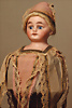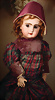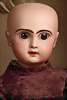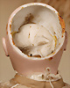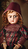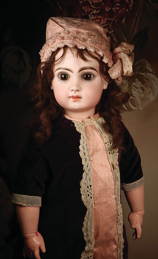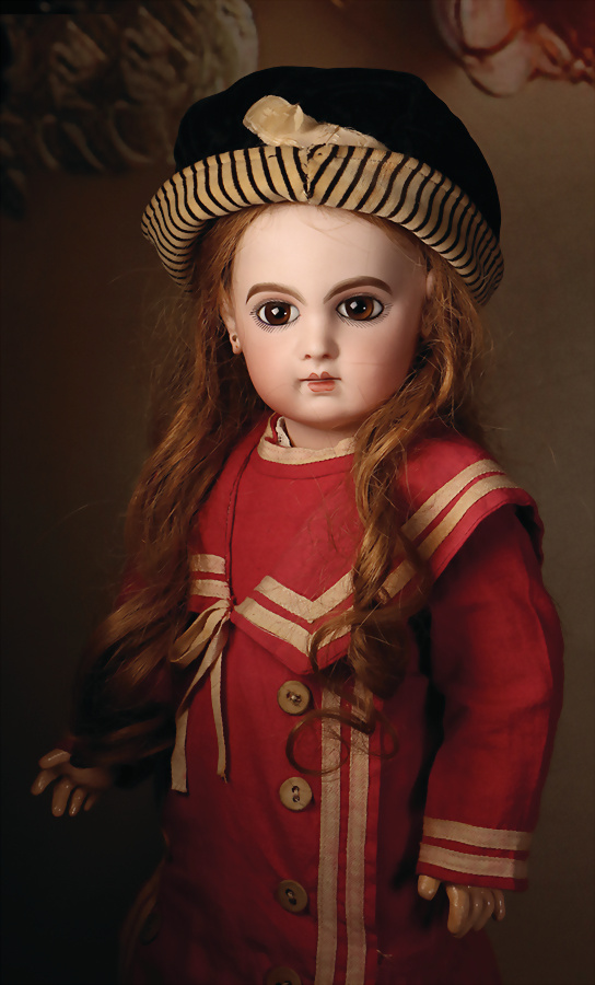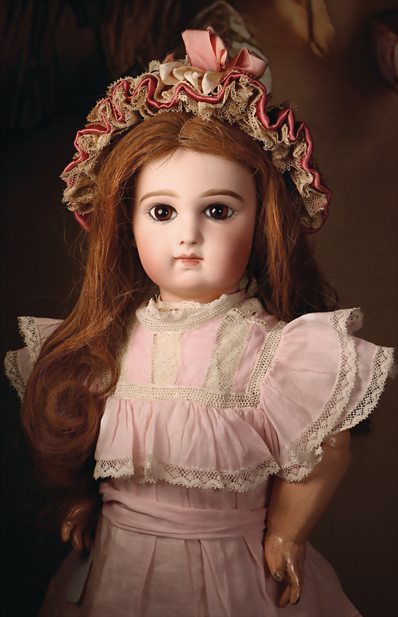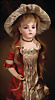 incised 8, um 1882, das Modell wurde nur für ca. zwei Jahre hergestellt, die Nackenmarkierung ist eingeritzt, Biskuit-Porzellan-Kopf, braune fest einges. Paperweight-Augen, dunkler Lidstrich, gemalte Wimpern, mauve farbener Lidschatten, gebürstete Augenbrauen, betonte Nasenlöcher und Augenwinkel, geschl. Mund, französischer Körper mit 8 losen Kugelgelenken, (Körpermarkierung) Jumeau Médaille d'Or Paris, 47 cm, alter Korkdeckel mit rehbrauner gelockter Echthaarperücke, ausdrucksstark
