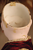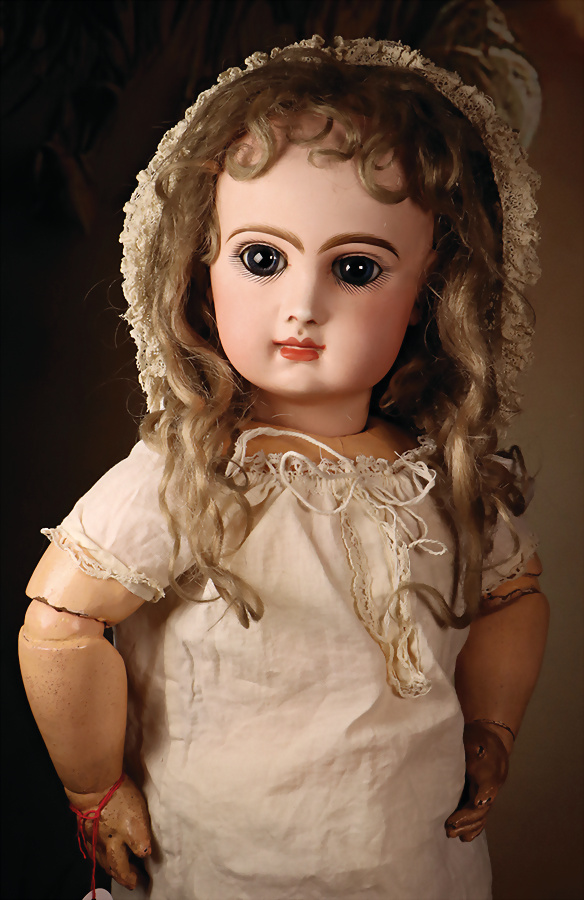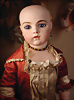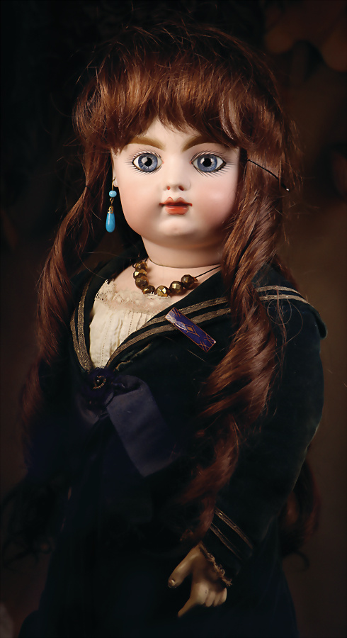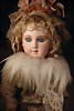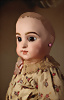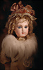 um 1886, fein modellierter Biskuit-Kopf mit eingesetzten blauen Paperweight-Glasaugen, dunkel gemaltem Lidstrich und üppig staffierten dunklen Wimpern, weit geschwungene, in breiten Pinselstrichen federartig ausgearbeitete Augenbrauen, akzentuierte Augenwinkel und Nasenflügel, geschlossener Mund mit schattierten und konturierten Lippen, mit Grübchen am Kinn, durchstochene Ohren, originaler französischer Kompositions- und Holzkörper mit 8 losen Kugelgelenken sowie feste Handgelenke, 48 cm Besonders hervorzuheben: Bekleidet mit originaler Jumeau-Chemise sowie passende Jumeau Schuhe, Gr. 8, orig., Korkdeckel, mit Echthaarperücke Zustand: Insgesamt hervorragend, kleiner Chip an dem rechten Ohrloch, Nackenmarkierung stärker verwaschen Markierung: Reste des roten Jumeau Stempels, D 8 Körper: blauer Stempel „ Jumeau Medaille d'Or Paris