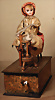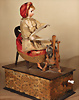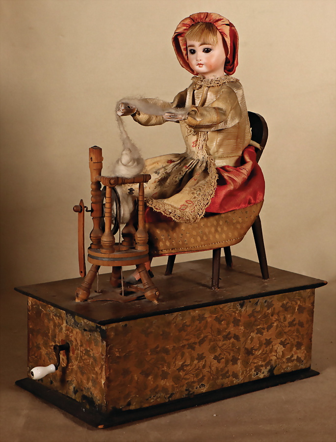 Frau am Spinnrad, H: 28,5 cm, Kurbelantrieb mit Musikspielwerk, Verbindung zwischen Hand u. Spinnrad fehlt, 1 Stange am Spinnrad fehlt, Bewegung der Puppe sowie Musikspielwerk intakt, Porzellan-Vollkopf, braune fest einges. Glasaugen, geschl. Mund, lose aufgesetzt