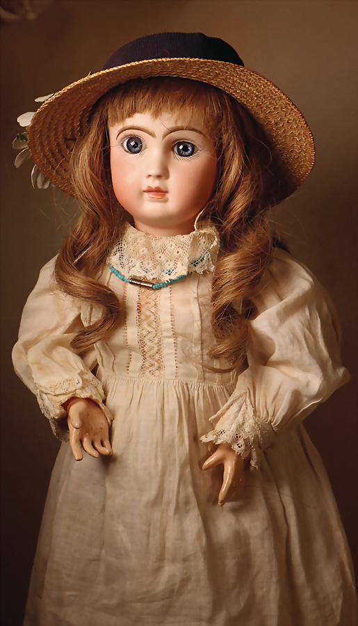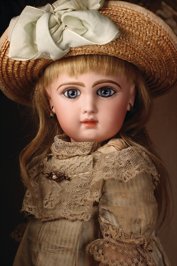 Pia`s Blog: ,, ...Um 1886 befand sich die Manufaktur Jumeau auf dem Zenit ihres Ruhmes und setzte Maßstäbe in Ästhetik und Qualität. Nach der Übernahme der Manufaktur durch Emile Jumeau 1873 setzte das Unternehmen zusehends darauf nicht nur Spielzeug zu schaffen sondern eher „Objets d’Art“ die dem Idealbild eines Kindes der gehobenen Gesellschaft gleichen sollten. Jumeau gewann zahlreiche Goldmedaillen mit seinen Puppen auf Weltausstellungen (u.a. 1878 Paris & 1885 Antwerpen) und erinnert auf seinen kleinen Kunstwerken mit dem blauen Stempel „Jumeau Médaille d´Or Paris“daran. Dieses Bébé ist ein Musterbeispiel des „French Look“. Während deutsche Puppen jener Zeit eher funktional waren, verkörpert Jumeau den Luxus und die Mode von Paris...“