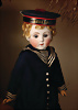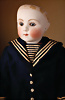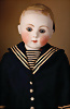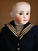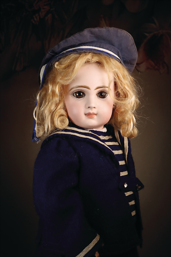 Einzigartiges spektakuläres französisches Bébé von Steiner, Serie D – bisher undokumentiert Biskuit-Porzellan-Kurbelkopf, hellblaue fest eingesetzte Strahleniris-Augen mit tiefschwarzer großer Pupille, zarter Lidschatten, geschlossener Mund mit fein modellierter Oberlippe, schattierte korallenrote Lippenbemalung mit zarten Außenkonturen und Ziwschenraumakzentuierung, durchstochene Ohrläppchen, originaler Gliederkörper mit festen Händen, antike blonde lockige Mohairperücke auf originalem Papiermachédeckel und schönem Marinehut mit Schriftzug, originales blaues Marinekleid mit edlen Knöpfen verziert, antike Strümpfe und Schuhe. Zustand: allgemein exzellent, unter Kinn oberflächliche Lasurlinie, kein Haarriss. Markierung: Sie D 1 (graviert Kopf). Hersteller: Steiner, ca. 1880. Größe: 41 cm Kommentar: Jules Steiner, um 1875, Bourgoin-Epoche, die Mona Lisa unter den Jules Steinern, das seltenste Modell der Steiner-Serie wurde hier entdeckt; Exemplare dieser Puppe sind praktisch unbekannt Dieses seltene Bébé besticht durch einen besonders aufmerksamen Ausdruck mit weit geöffneten Blick, unterstrichen durch feinstes Biskuitqualität mit zarter sowie edler Bemalung, zum krönenden Abschluss zeigt sie sich in einem hervorragenden originalen Matrosenkostüm, mit passenden Schuhen und Strümpfen