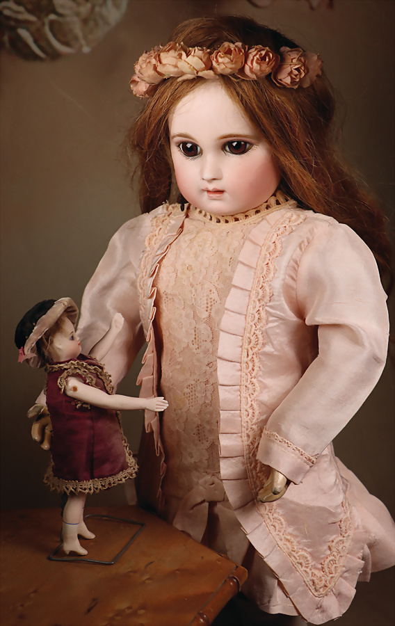 Schönes französisches Bébé von Jumeau, Porträt-Jumeau in seltener Schrank-Größe Biskuit-Porzellan-Kurbelkopf, mandelförmige braune fest eingesetzte Paperweight-Augen, ausgeprägter rosa Lidschatten, geschlossener Mund mit leicht definiertem Zwischenraum, schattierte Lippen und Außenkonturen, durchstochene Ohrläppchen, original Gliederkörper mit 8 losen Kugeln und festen Händen, antike blonde Mohairperücke auf originalem Korkdeckel, antike aufwendige beige Kleidung mit Punkten, Spitze und Stickerei verziert, Hut, feine rosa Seidenschuhe. Zustand: allgemein exzellent. Markierung: 5 (Kopf) Jumeau Medaile d’Or Paris (Stempel Körper) Hersteller: Emile Jumeau, ca. 1880. Größe: 37 cm.