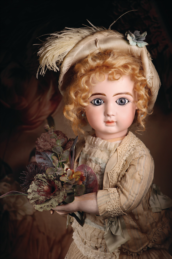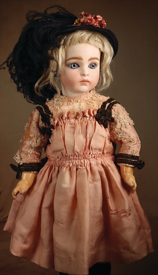 Seltenes französisches Bebé von Jumeau, E.J.A. mit strahlenden blauen Augen Biskuit-Porzellan-Kurbelkopf, hellblaue fest eingesetzte Strahleniris-Augen, rosa Lidschatten, geschlossener Mund mit leicht definiertem Zwischenraum, schattierte Lippen und zarte Außenkonturen, tiefes Kinngrübchen, aufgesetzte modellierte Ohren, durchstochene Ohrläppchen, original 8 Kugel-Gliederkörper mit festen Handgelenken, antike blonde lockige Mohairperücke auf original Korkdeckel , antikes aufwendiges beiges Kleid, verziert mit Spitze und toller Federstola und dekorativer Haube, antike Leder-Schuhe. Zustand: allgemein exzellent. Markierung: EJ.A 10 (Kopf) Jumeau Médaille d’Or Paris (blauer Stempel Körper) Hersteller: Emile Jumeau, ca. 1879. Größe: 68 cm Historische Einordnung: Das Modell „E.J.A“ ist bereits in einem Pariser Spielwarenkatalog des Jahres 1879 nachweislich verzeichnet und wurde ausschließlich in zwei repräsentativen Großformaten (Größen 10 und 12) angeboten – eine bemerkenswerte Einschränkung innerhalb des damaligen Sortiments. Der ausgewiesene Verkaufspreis lag bei mehr als dem Doppelten der übrigen Jumeau-Bébés jener Zeit und dokumentiert damit unmissverständlich die herausgehobene Stellung dieses Modells im Luxussegment der Pariser Puppenproduktion. Aufgrund archivalischer Hinweise und der äußerst geringen Anzahl bekannter Exemplare ist von einer sehr kurzen Produktionsphase von vermutlich nur zwei bis drei Jahren auszugehen, was die außerordentliche Seltenheit und sammlerische Bedeutung dieses frühen Jumeau-Bébés zusätzlich unterstreicht. Provenienz: " Sammlung Gerda Ott "