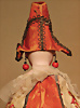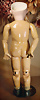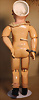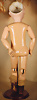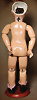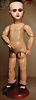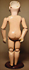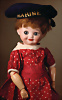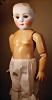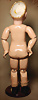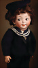 Kleines Biskuit-Googly, braune seitl., blickende Glasaugen, gemalter Melonden-Mund, errötete Wangen, fester Kopf, gegliederter Körper, modellierte Schuhe und Strümpfe, originale Kleidung, 13 cm
