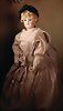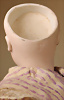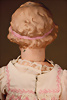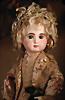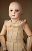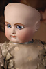 Modell, 0, feiner Biskuit-Voll-Kopf mit blauen, spiralförmig geschliffenen blauen Glasaugen, dunkler Irisumrandung, dunkler Lidstrich, leicht schattierte Lieder, sorgfältig gemalte Wimpern, gefiederte Augenbrauen und dezent akzentuierte Nasenlöcher, leicht geöffneter, geschlossener Mund mit deutlicher offene Bereich zwischen den Lippen, Biskuit-Ohren mit durchstr. Ohrläppchen, 31 cm, antikes Seidenkleid, orig. blonde Perücke Zustand: allgemein exzellenter Erhaltungszustand, originalem Körper und originaler Fassung