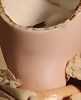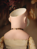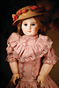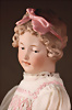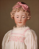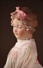 anmutige Charakterpuppe mit rosé getöntem Biskuit-Vollkopf, aus der Manufaktur der Gebrüder Heubach, dieses fein gearbeitete Modell 7865 gehört zu den qualitätsvollen Figuren der frühen 1910er Jahre, bekannt für ihre sensible Modellierung und ausdrucksstarke Mimik, kurz modelliertes, braun gelocktes Haar mit zart schattierter Bemalung, seitlich angesetzte, plastisch ausgearbeitete rosa Haarschleife, gemalten Augen sind in sanft gesenktem Blick dargestellt, mit stark modellierten Lidpartien, fein abgestimmten Brauen, originaler Kompositions- und Holzkörper mit Kugelgelenken, reizvolles antikes Kleid mit rosa Bestickung passende Seidenschuhe sowie originales Chemise, 33 cm Zustand: insgesamt exzellenter Zustand Wertigkeit: Gebrüder Heubach, Thüringen, um 1912, seltene Modellierung