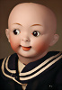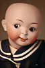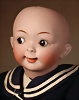 beliebtes „Jubilee Googly“ von Hertel & Schwab, um 1918, fein gearbeitete Biskuit-Socket-Head besticht durch seine rundliche, bewusst pausbäckige Modellierung, die dem Kindergesicht eine besonders lebendige und verschmitzte Ausstrahlung verleiht, braune seitlich blickende Schlaf-Augen, gemalte geschwungene Wimpern, dezent akzentuierte Augenwinkel, leicht aufwärts gerichteten Stupsnase unterstreichen den schelmischen Gesichtsausdruck, geschlossene Mund in typischer „Wassermelonenscheiben“-Form mit zart schattierten Lippen ist ein prägnantes Merkmal dieses Modells, originale Toddler-Kompositions- und Holzkörper, 36 cm, gelockte braune Echthaarperücke, Baumwoll-Matrosenkleidung, Zustand: Insgesamt ausgezeichnet Markierung: „165-4'', Provenienz: " Sammlung Gerda Ott "