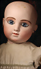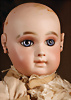 „Tête Jumeau“ Bébé, seltenes Übergangsmodell, Frankreich, um 1886, feiner Biskuit-Porzellan-Kopf mit leuchtend blauen, fest eingesetzten Paperweight-Augen, dunkel gemalter Lidstrich, üppig und kunstvoll ausgeführte Wimpern, rosé schattierte Lider sowie in Pinselstrichtechnik gestaltete, fein gefiederte Augenbrauen, akzentuierte Nasenlöcher und Augenwinkel, geschlossener Mund mit konturierten, schattierten Lippen, separat aufgesetzte, durchstochene Ohren, originaler Jumeau Kompositions- und Holzkörper mit festen Handgelenken, 62 cm, schönes teilweise antikes hellblaues Kleid, antike Schuhe Markiert: Rabery Paris Markierungen: Hinterkopf: Depose Tête Jumeau Bté SGDG 11, Körperstempel: Jumeau Médaille d’Or Paris Zustand: allgemein exzellent.