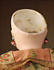 schönes frühes französisches Bébé von Gaultier mit seltenem Lederkörper in Cabinet-Größe Biskuit-Porzellan-Kurbelkopf, auf Biskuit-Brustplatte, braune, fest eingesetzte Paperweight-Augen, geschlossener Mund mit modellierter Zunge, fein bemalter Lippenschattierung und Außenkonturen, zarte Wangendekoration, durchstochene Ohrläppchen, Lederkörper mit Zwickeln, Porzellanunterarme/hände, fragile blonde Mohairperücke auf originalen Korkdeckel, antike, wohl originale bordeauxfarbene Seidenrobe mit Spitzenverzierungen, dekorativer floraler Hut, antike Wäsche, antike Socken, antike Lederschuhe gemarkt 6 Déposé 27. Zustand: allgemein exzellent, minimale Lasurlinie an linker Augenbraue, davon kein Haarriss ausgehend. Markierung: F. 3/0 G. Hersteller: Gaultier, ca. 1880. Größe: 33 cm