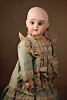 modellierter Biskuit-Vollkopf, eingesetzt mit großen blauen Spiral-Glasaugen mit dunkler akzentuierten Irisrändern, betontem Lidstrich, gemalten Wimpern, stärkere Dekoration auf Augenlidern und Wangen, geschlossener Mund mit leicht geöffnet mit Zwischenraum, schattierte und konturierten Lippen, durchstochene Ohrläppchen, blonde Mohair-Perücke, originaler Sonneberger Kompositions- und Holzkörper, voll kugel gelenkig gearbeitet, mit geraden Handgelenken, 41 cm, Markierung: 10 Zustand: allgemein exzellenter Erhaltungszustand, Chip am linken Ohrloch, Kompositions- und Holzkörper an den Gelenken farblich überarbeitet Anmerkung: antikes blaues Seidenkleid mit alter Wäsche sowie alten Schuhen