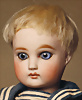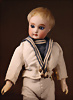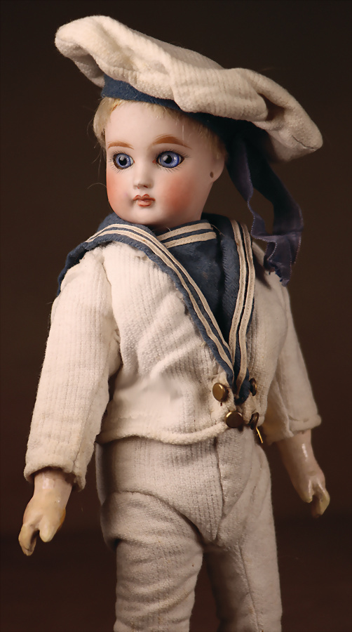 schöne frühe deutsche Porzellan-Kopf-Puppe, um 1889, Vollkopf, Markierung: 0, hellblaue Strahleniris-Augen, geschlossener Mund, mit feiner Lippenbemalung, mit Konturen, zarte Wangenbemalung, durchst. Ohren, deutscher Gliederkörper mit festen Handgelenken, teilweise ausgebessert, blonde fest aufgesetzte Mohairperücke, 27 cm, Matrosen-Kleidung Zustand: allgemein exzellent, Markierung: 0, Hersteller: William Dehler, um 1885, der deutsche Händler, dessen Puppen den französischen Puppen der damaligen Zeit sehr ähnlich waren, unterhielt ein Büro am Blvd. de Strasbourg in Paris, wo er enge Beziehungen zu den französischen Puppengeschäften unterhielt und Zugang zu neuen Modellen französischer Puppenfirmen hatte
