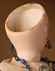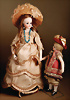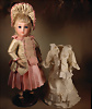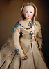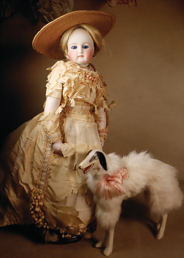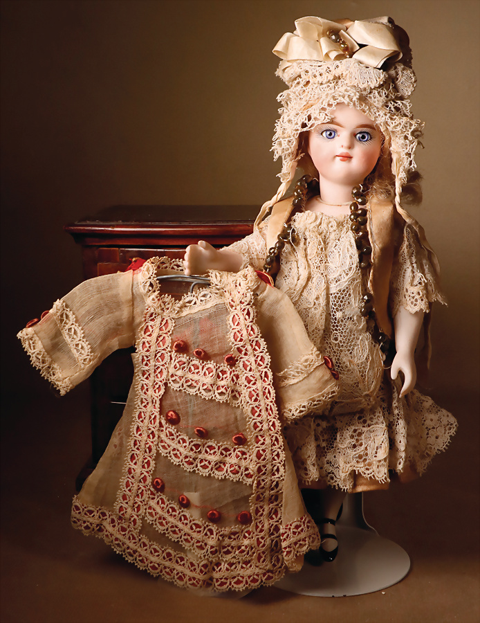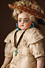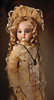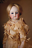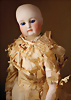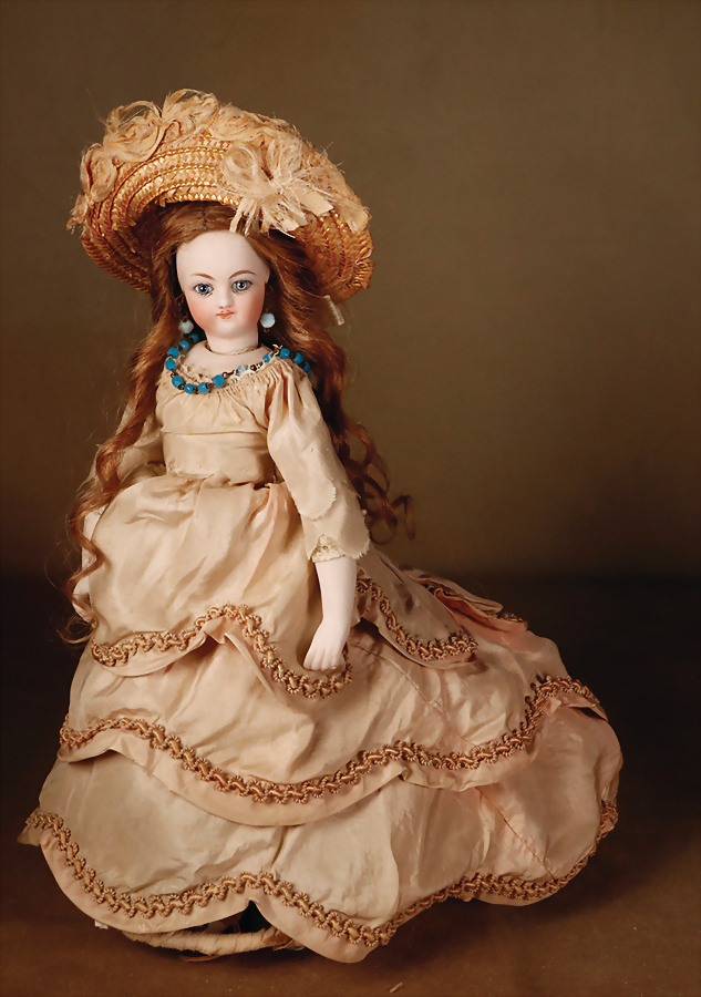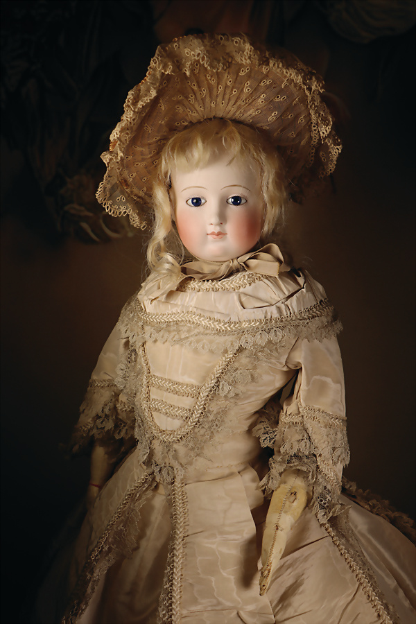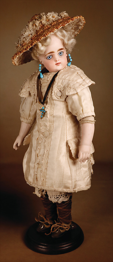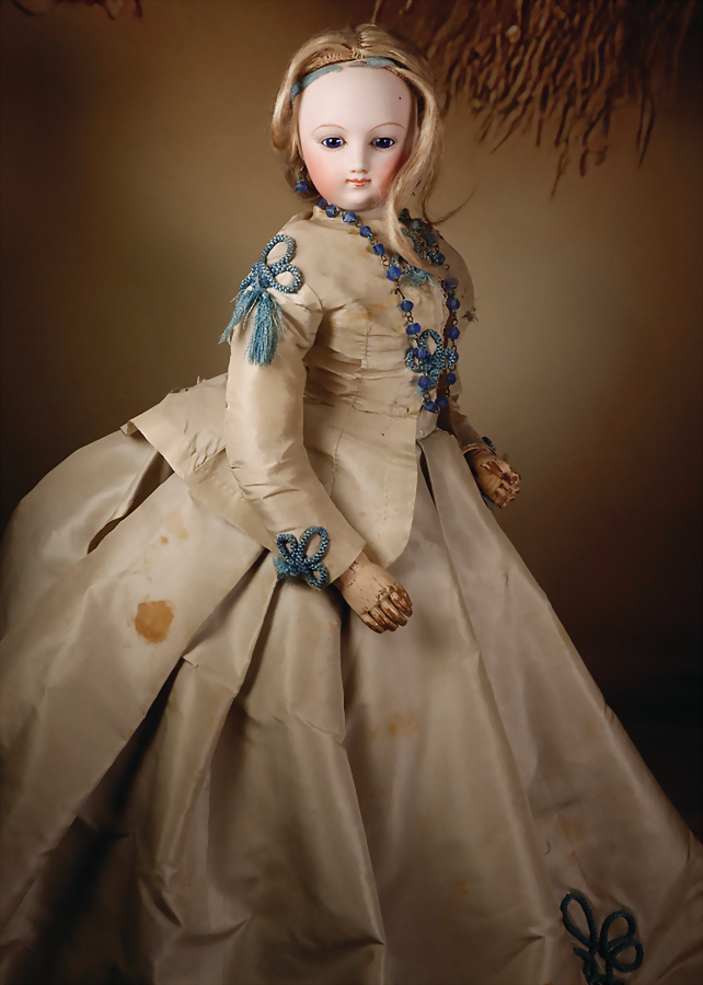 feinster heller Biskuit-Porzellan Brustblatt-Kopf auf Porzellan-Brustblatt, zart errötete volle Wangen, kobaltblaue fest eingesetzte Glasaugen, fein bemalte Wimpern unter geschwungenen Brauen, geschlossener Mund mit dezent konturierten Lippen, Ziegenleder-Körper mit angewinkelten Armen und einzeln abgenähten Fingern, schmale Taille, Kniezwickeln, aufwendig gearbeitete beige Robe, blonde gelockte Perücke mit orig. Korkdeckel, 64 cm, Barrois, um 1865 Zustand: Allgemein ausgezeichneter Erhaltungszustand Charakteristisch für diese Zuschreibung sind die feine Qualität des Biskuits, die zurückhaltend-natürliche Modellierung der Gesichtszüge sowie die harmonischen Proportionen. Viele Exemplare dieser Werkstatt sind ungemarkt, sodass die Einordnung anhand stilistischer Kriterien erfolgt.