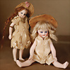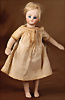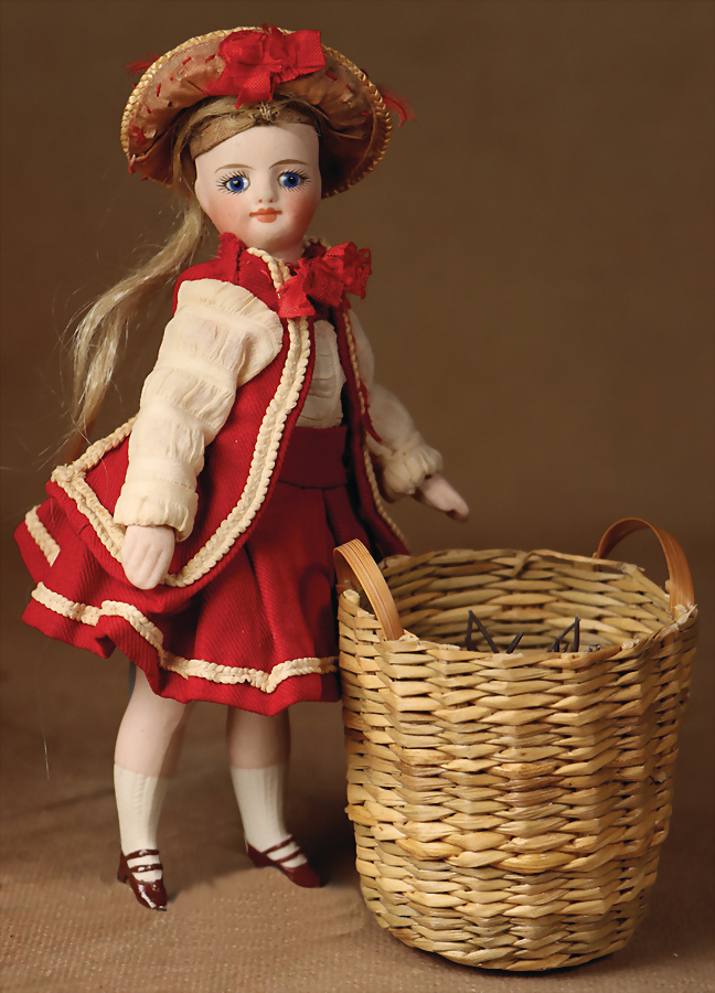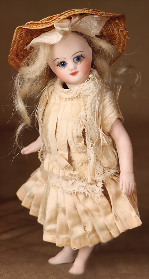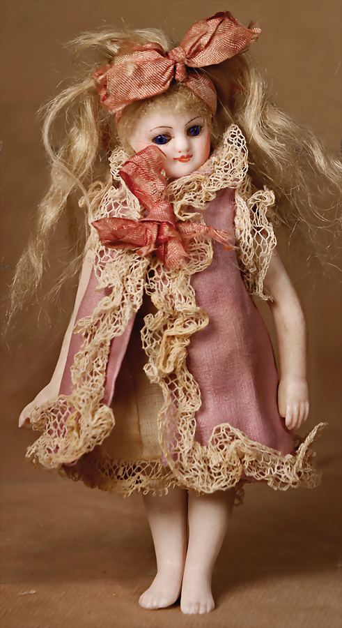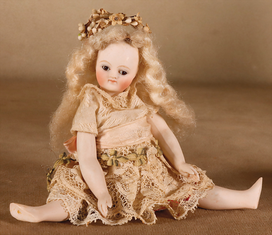 Ausgefallene Barfuß-Mignonette, feinstes Biskuit-Porzellan Kopf, Kopfmarkierung I, braune fest einges. Glasaugen, hellbraune gefiederte Augenbrauen, zarte Bemalung, geschl. Mund, bewegl. Biskuit-Arme und -Beine, ausgeformter Bauchnabel, kleinere Chips an den Verbindungsstellen der Arme und Beine, fest aufges., blonde gelockte Perücke, 16 cm, orig. Kleidung, ausdrucksstark, Provenienz: '' Zeitlose Eleganz der Modepuppen Ikonen, die Frohnwieser Collection''