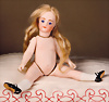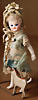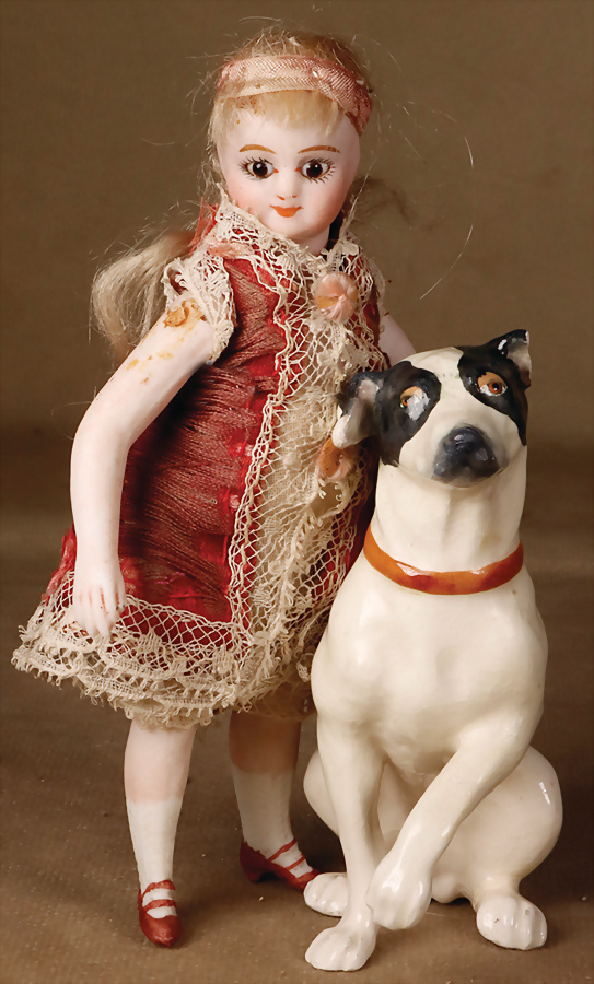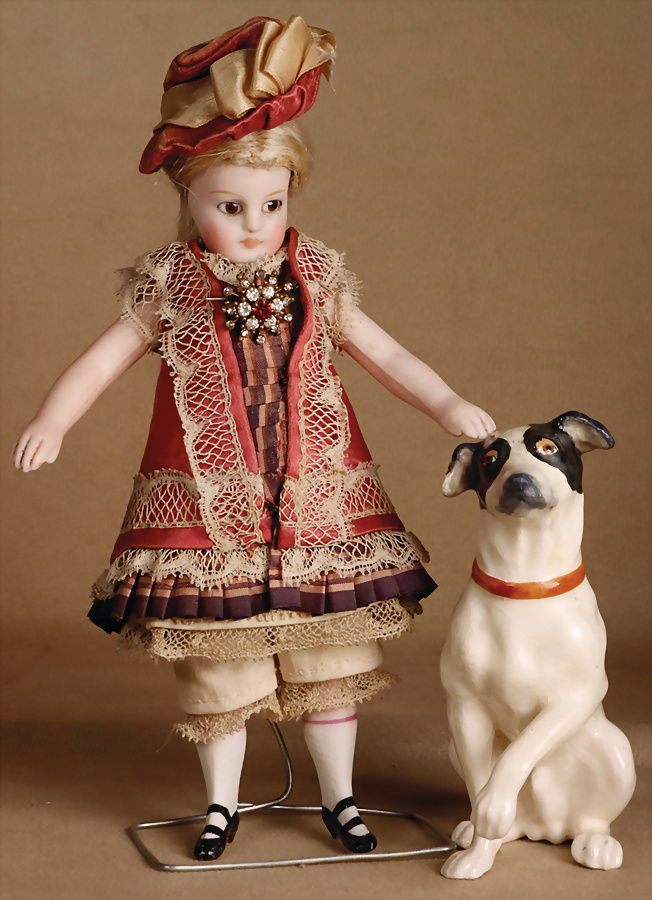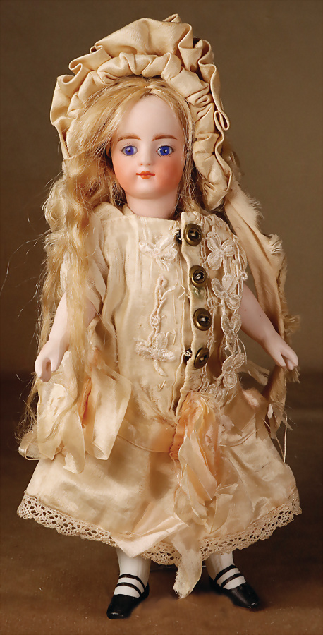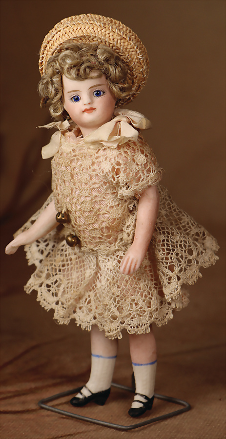 exquisite Mignonette von Simon & Halbig, Frankreich, um 1889, feines Biskuit-Porzellan, Kurbelkopf, fest einges., kobaltblauen Glasaugen, gemalte Wimpern, gefiederte Augenbrauen, betonte Nasenlöcher und Augenwinkel, geschlossener voller Mund, getönte Wangen, fest aufges. Mohair-Perücke, kindlicher, Biskuitkörper, mit kleinem Bäuchlein, ausgeformten Bauchnabel, bewegl. Arme und Beine, modellierte Kniestrümpfe und Absatzschuhe, 19 cm, Zustand: insgesamt ausgezeichnet, minimale Chips an den Verbindungsstellen Provenienz: '' Zeitlose Eleganz der Modepuppen Ikonen, die Frohnwieser Collection''
