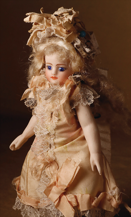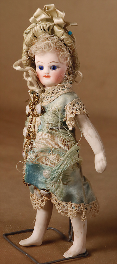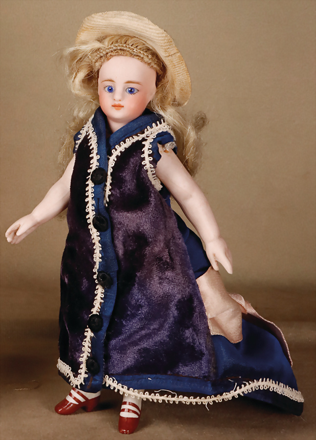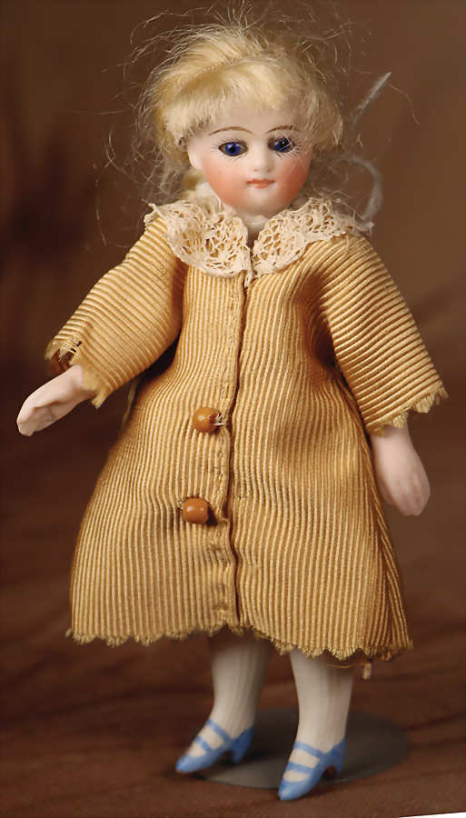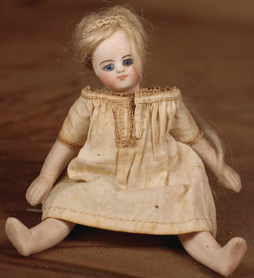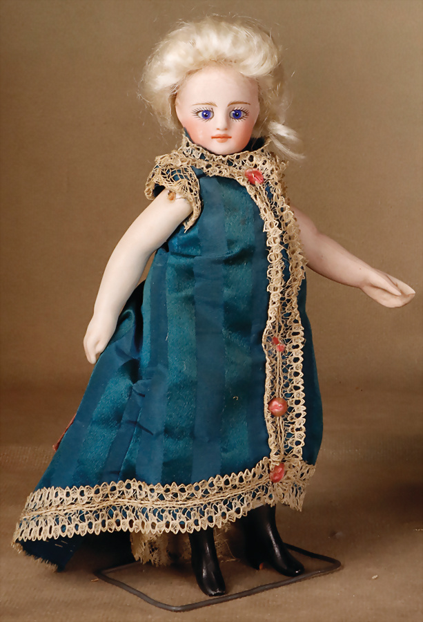 Französische Mignonette, um 1880, feinstes Biskuit-Porzellan, Kopf, blaue fest einges. Glasaugen, hellbraun gemalte Augenbrauen, geschl. Mund, bewegl. Biskuit-Arme und -Beine, modellierte Schuhe und Strümpfe, fest aufges., blonde gelockte Perücke, 16 cm, ausdrucksstark Provenienz: '' Zeitlose Eleganz der Modepuppen Ikonen, die Frohnwieser Collection''