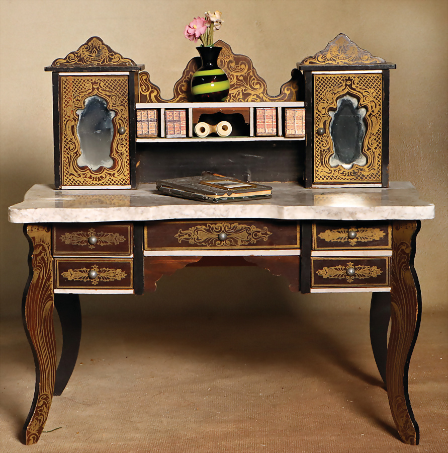 Schreibtisch mit Boulle-Ornamenten, Marmorplatte, 1 Riss auf der Platte (kl. Ecke seitl. bestoßen, sonst schöner Orig.-Zust.), 22 cm, schöne Dekoration zu kl. früher Puppe