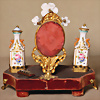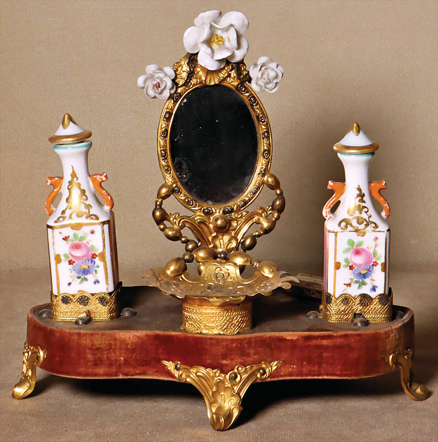 Sehr schönes französisches Luxusaccessoire, Rocaille, typischer französischer Waschtisch um 1855-1870, geeignet für französische Modepuppen, ovaler Spiegel mit Messingmontierung, zwei Porzellanflakons, Eau de Cologne, handbemalte Blumen und Golddekor, kleine Schale für Ringe, Haarnadeln, Seide etc., auf Holzsockel, Samt bezogen, 20 cm x 17 cm, Provenienz: „Sammlung Frohnwieser“